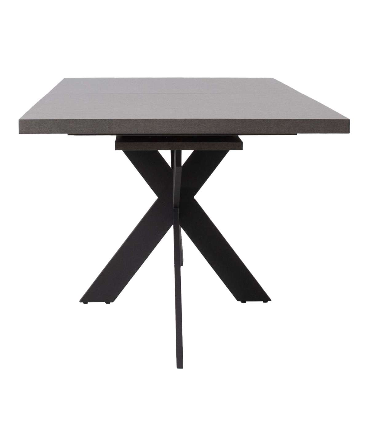 Столешница из серого меламина. Стол можно удлинить посередине. Складная удлинительная пластина шириной 40 см расположена под столешницей. Черные металлические с порошковым покрытием крестовины.
