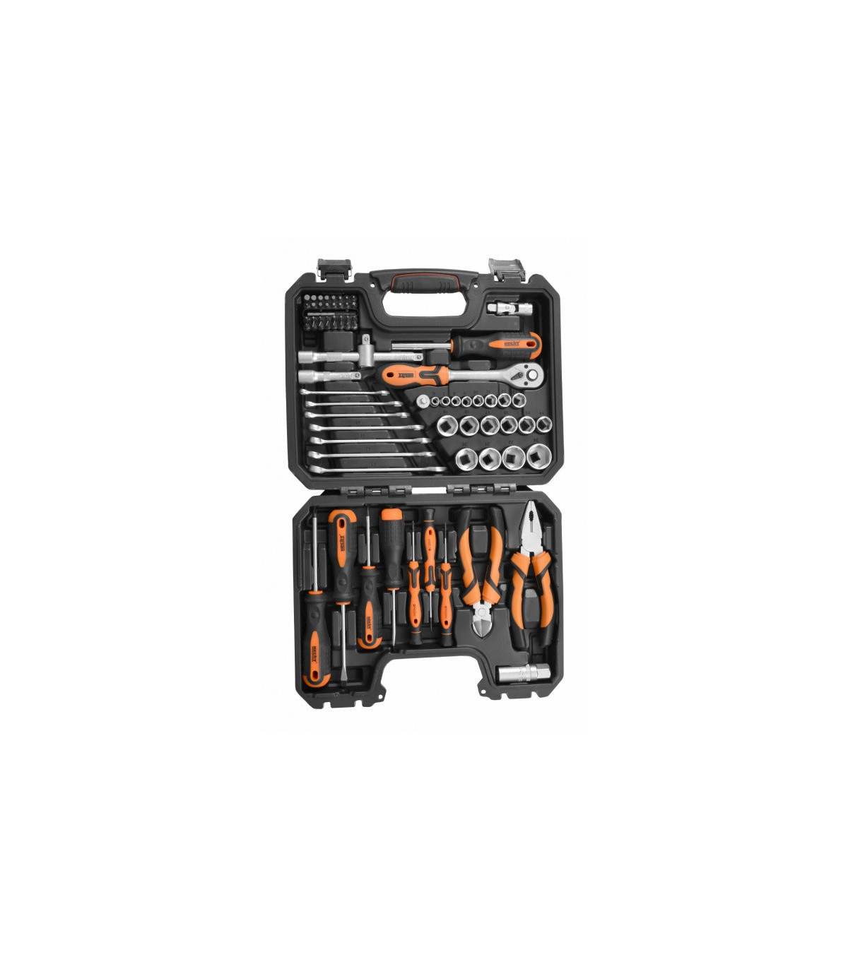 Komplekti kuuluvad: kruvikeerajad (rist ja tava), lehtvõtmed, padrunvõtmed, näpitstangid, lõiketangid, magnetiga otsikute hoidja, erinevad kruviotsikud,jne. Plastikust tööriistakast.