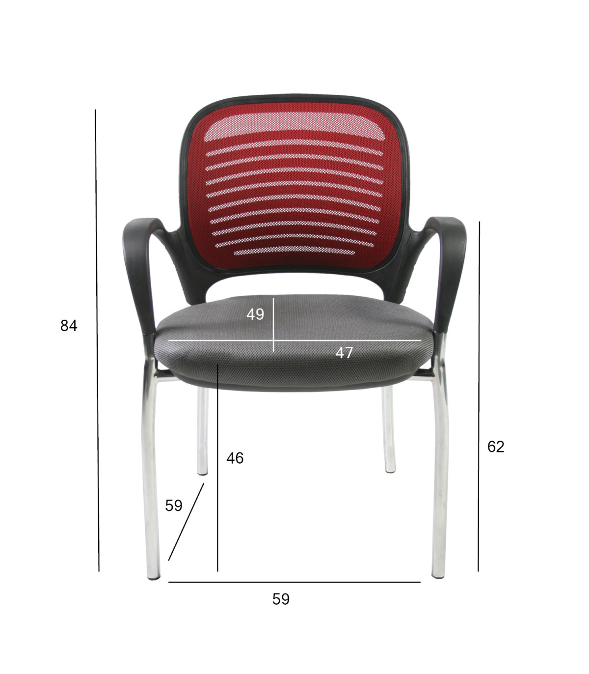Материал покрытия: сиденье: сетка из полиэстера, 30 000 Martindale, цвет: серый, спинка: сетка из полиэстера, цвет: бордо. Цвет корпуса: хромированный. Подлокотники: материал: пластик. Размеры: высота 84см, высота сиденья 46см, глубина сиденья 48см, ширина сиденья 48см. Дополнительная информация: стулья штабелируются.