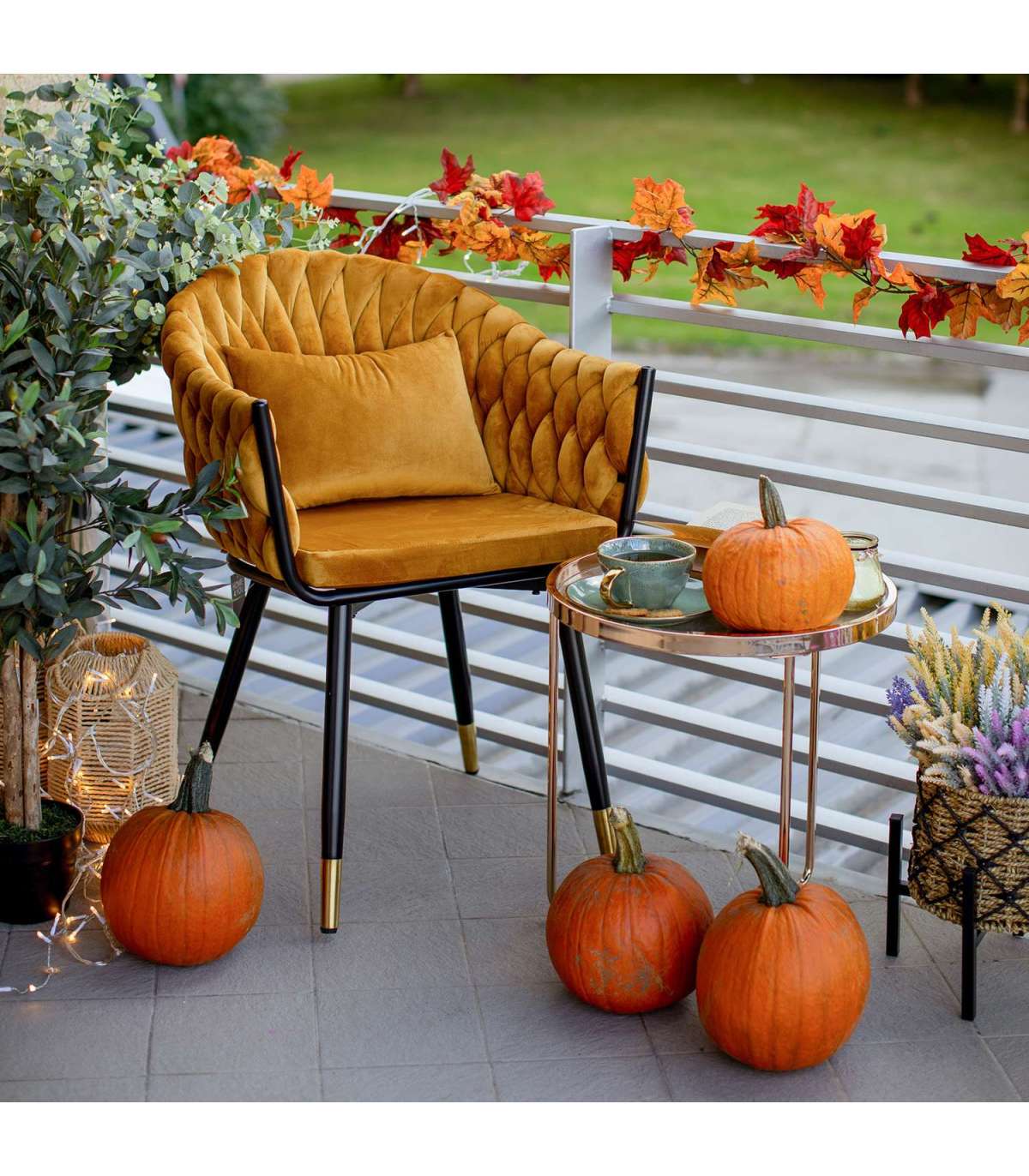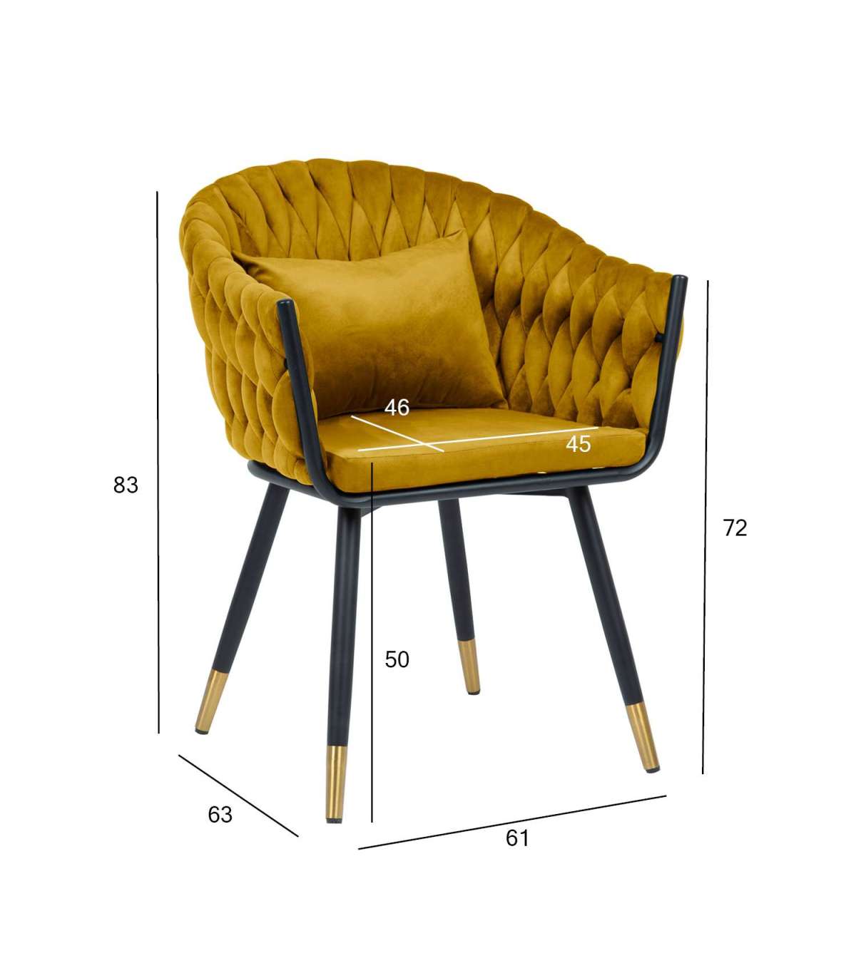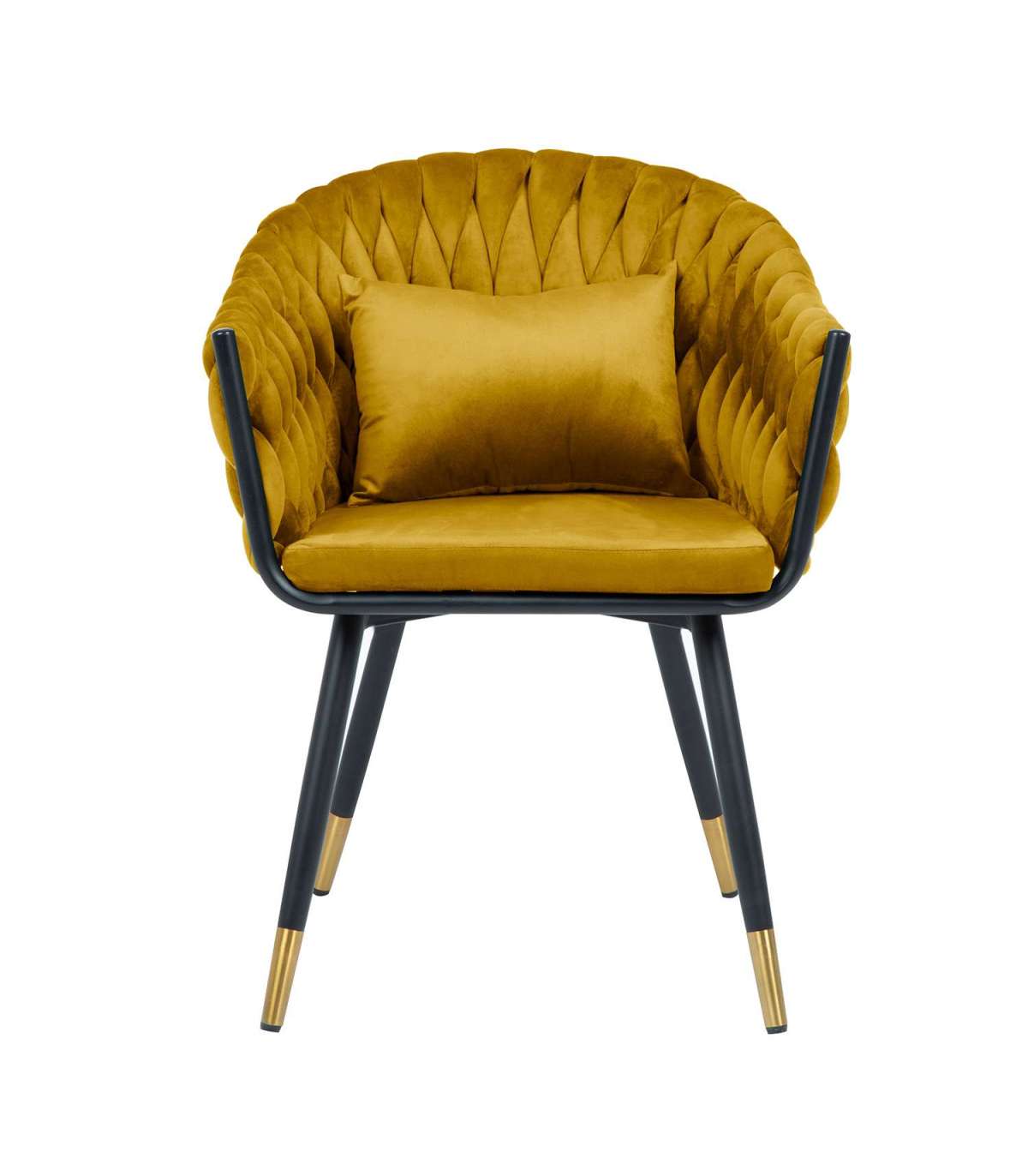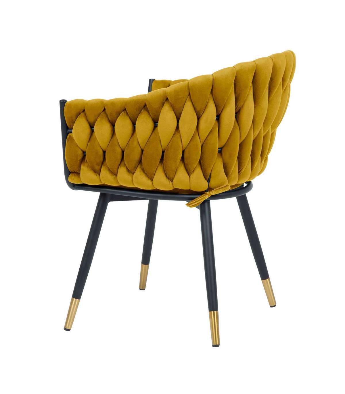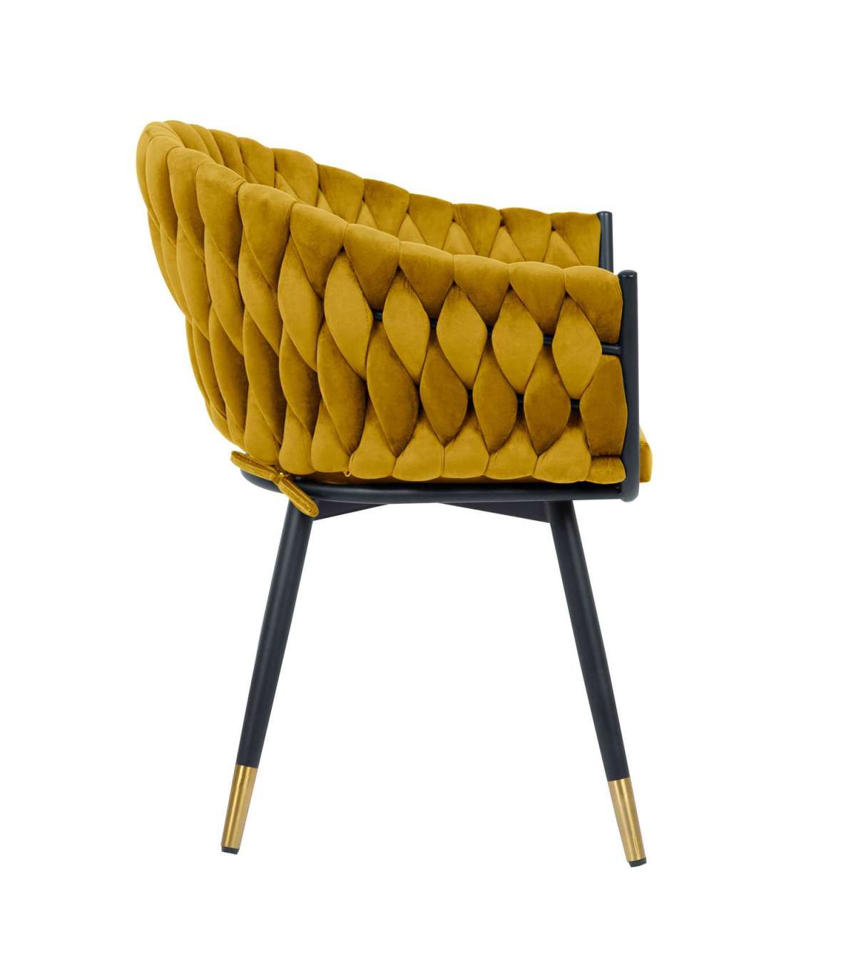 Стул FLORA, золотисто-желтый бархат. Сиденье и спинка стула обиты мягкой тканью и обиты бархатом. Объемная волнообразная набивка спинки достигается в технике плетения. Небольшая дополнительная подушка на спинке стула обеспечивает больший комфорт при сидении. Материал покрытия: 100% полиэстер, 260 г/м?. Martindale 25 000. Ножки и каркас стула металлические и покрыты порошковой краской черного цвета, нижние концы ножек - золотые. Размеры кресла 63x46xH82см, высота сиденья 48,5см. Максимальный вес 120кг.