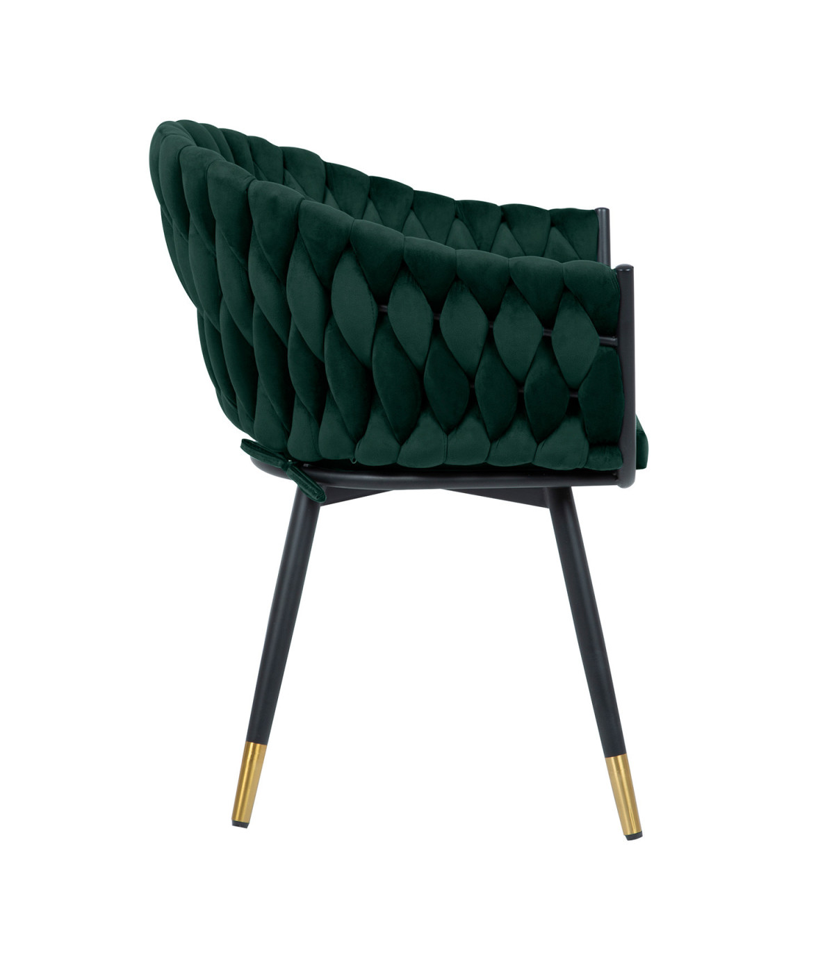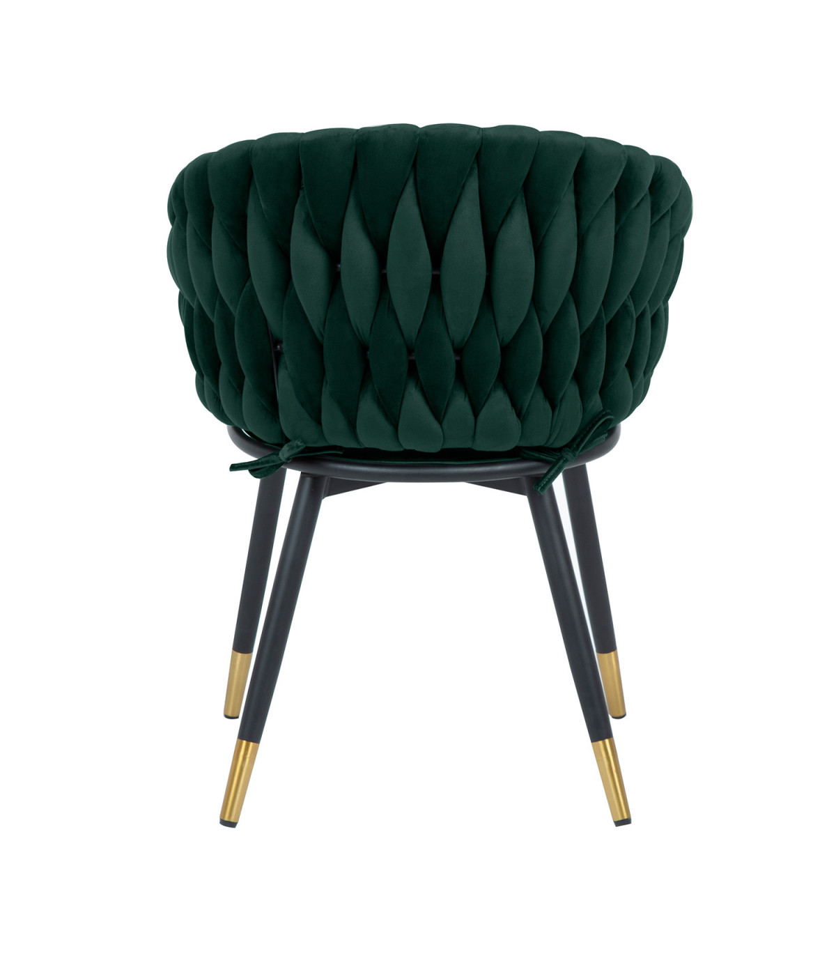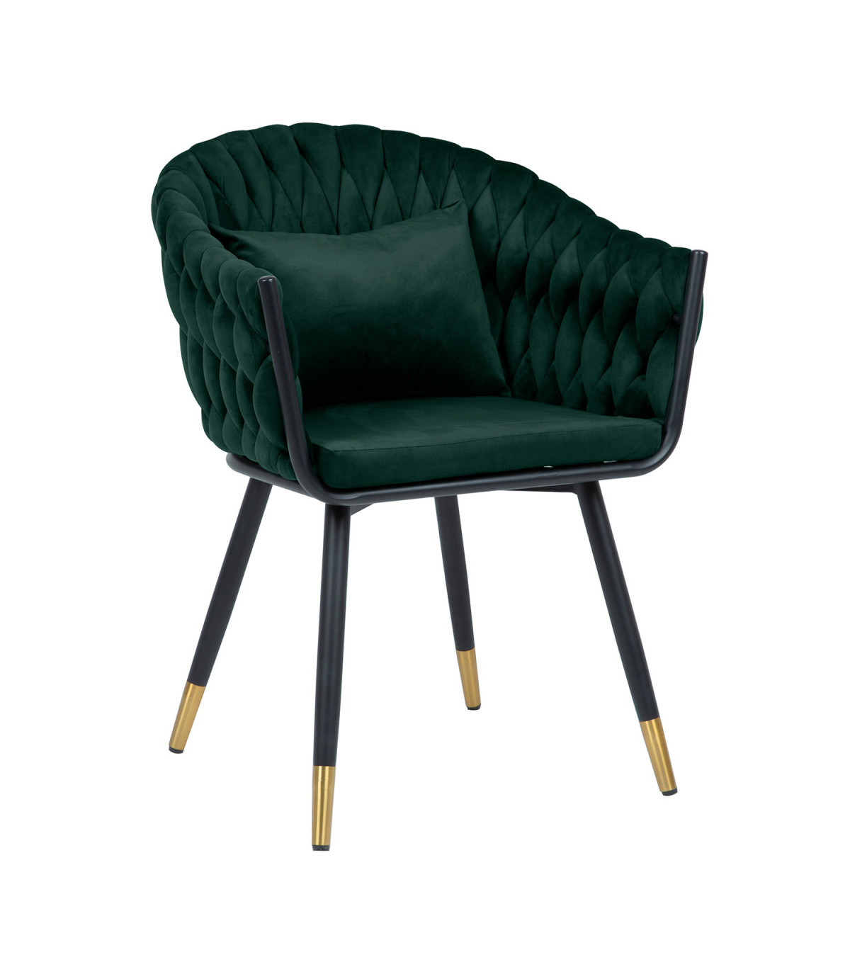 Стул FLORA, темно-зеленый бархат. Сиденье и спинка стула обиты мягкой тканью и обиты бархатом. Объемная волнообразная набивка спинки достигается в технике плетения. Небольшая дополнительная подушка на спинке стула обеспечивает больший комфорт при сидении. Материал покрытия: 100% полиэстер, 260 г/м?. Martindale 25 000. Ножки и каркас стула металлические и покрыты порошковой краской черного цвета, нижние концы ножек - золотые. Размеры кресла 63x46xH82см, высота сиденья 48,5см. Максимальный вес 120кг.