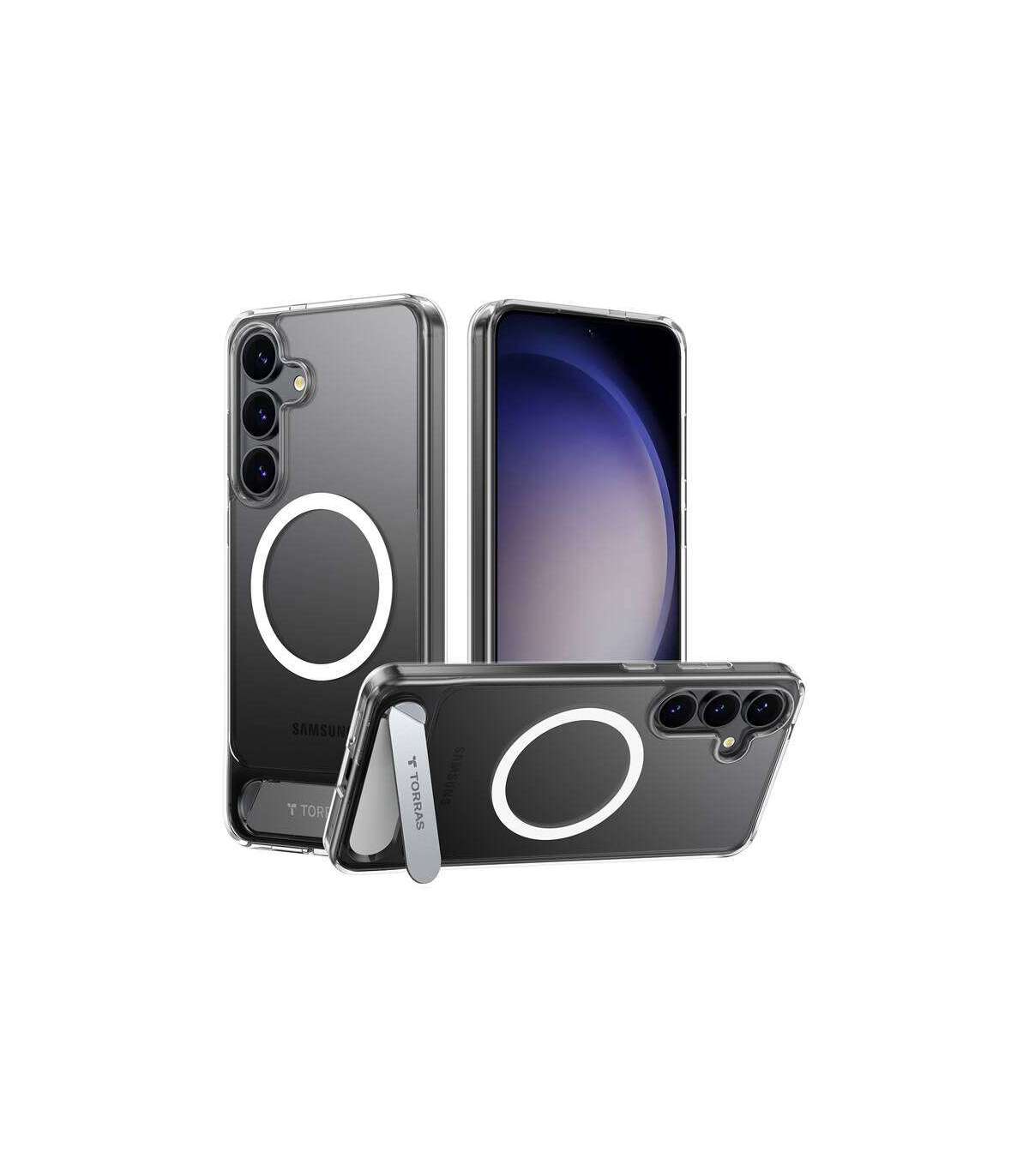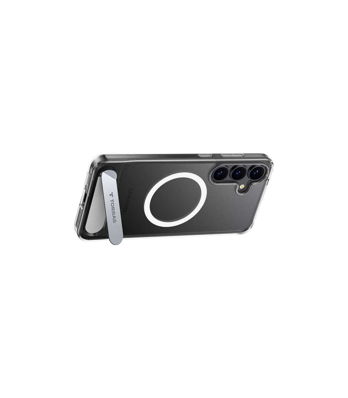 The Torras Pstand case for Samsung S25+ features a magnetic design and offers a stable stand for comfort and protection of your device. It also allows fast wireless charging, and compatibility with magnetic accessories enhances its functionality.