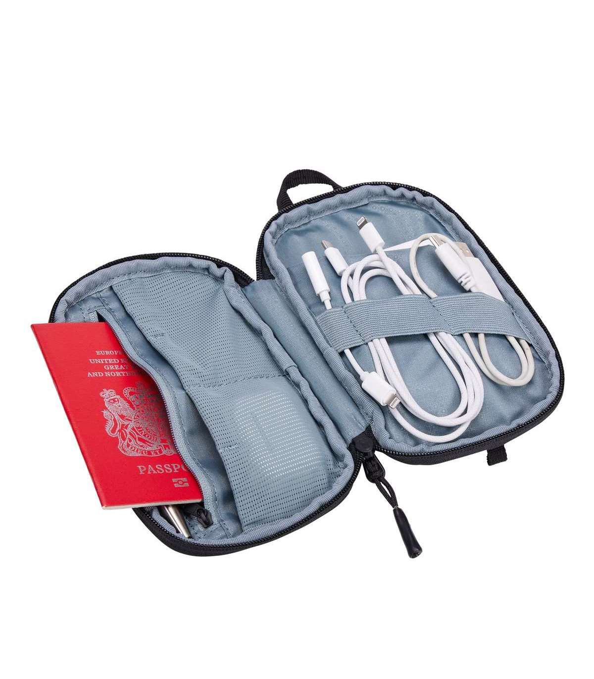 Korraldage kaableid, adaptereid, kõrvaklappe ja väikseid isiklikke tarvikuid erinevatesse mitmekülgsetesse taskutesse ja elastsetesse aasadesse