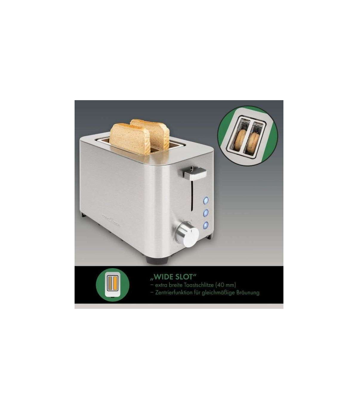 „Wide slot“ – extra wide toast slots (40 mm) for e. g. bagels, toast rolls