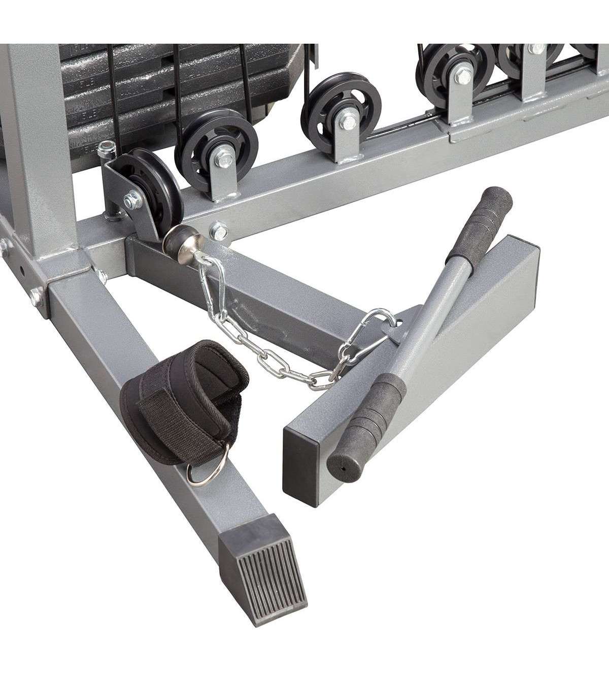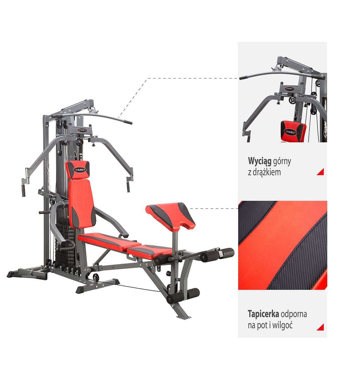 TYTAN 10 HMS is a professional fitness machine intended for home use. It is made of top quality materials which guarantee excellent stability and safety of use. The set includes a hooking and revolving bar, a single bracket and an ankle strap.The home gym is equipped with a comfortable 3-position adjustable seat. Durable foam covered with a modern, carbon-style upholstery of increased durability ensure comfort. A special profiled structure stabilises body position.Tytan 10R enables safe exercise of various muscles just like specialist machines used at professional gyms. All handles come with rubber finishing that ensures a secure grip and anti-slip surface.The braided wire rope has a capacity of 1000 kg, while the backrest can be adjusted to an angle within a range of -25°÷-90°. The machine will be appreciated by both men and women trying to improve their fitness and silhouette, or develop and increase their muscle mass.The machine allows you to work on all muscle groups: back muscles, pectoral muscles, traps, core muscles, gluteal muscles, forearms, deltoids, triceps, as well as leg muscles.Exercises:seated bench pressbench pressbutterfly apparatuslatissimus towerleg muscle trainerhigh pulleypreacher curl padSpecification:Frame profile: 5 × 5 cmBraided wire rope with capacity of 1000 kgDual bearingsAdditional weight cover3-position adjustable seatBackrest adjustment range: (-25°÷-90°)Assembled dimensions:length: 274 cmwidth: 162 cmheight: 203 cmBackrest dimensions:length: 55 cmwidth: 33 cmHeadrest dimensions:length: 20 cmwidth: 20 cmBench:total length: 121 cmseat: 37 x 41 cmseat: 29 x 76 cm4-position bench adjustment3-position seat adjustmentPreacher curl pad:length: 33 cmwidth: 46 cm2-position height adjustmentArms for flys:span: 141 cm3-position arm adjustmentArms for bench press:handle width range: 64 – 99 cm5-position adjustment of arm heightWidth of the high pulley bar: 110 cmWidth of the lower pulley bar: 46.5 cmBraid length: 66 cmGrip width: 12 cmGrip diametre: 3 cmStack weight: 90.72 kgProduct weight: 179 kgMaximum user weight: 140 kgThe set includes:hooking and revolving barsingle bracketankle strapRemarks:Not for commercial use24 months warrantyImporter: Abisal Ltd. | Poland | 41-807 Zabrze | Pyskowicka Street 17 | e-mail: abisal@abisal.plAbisal Ltd.. declares that the products sold by the company are safe and meet the requirements contained in the Act on General Product Safety of December 12, 2003. (Journal of Laws of December 31, 2003)