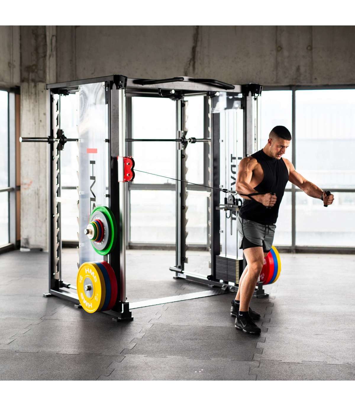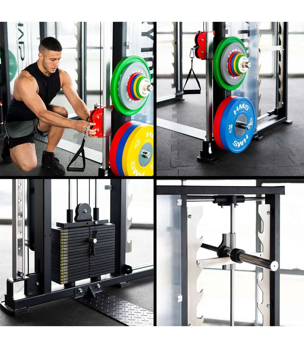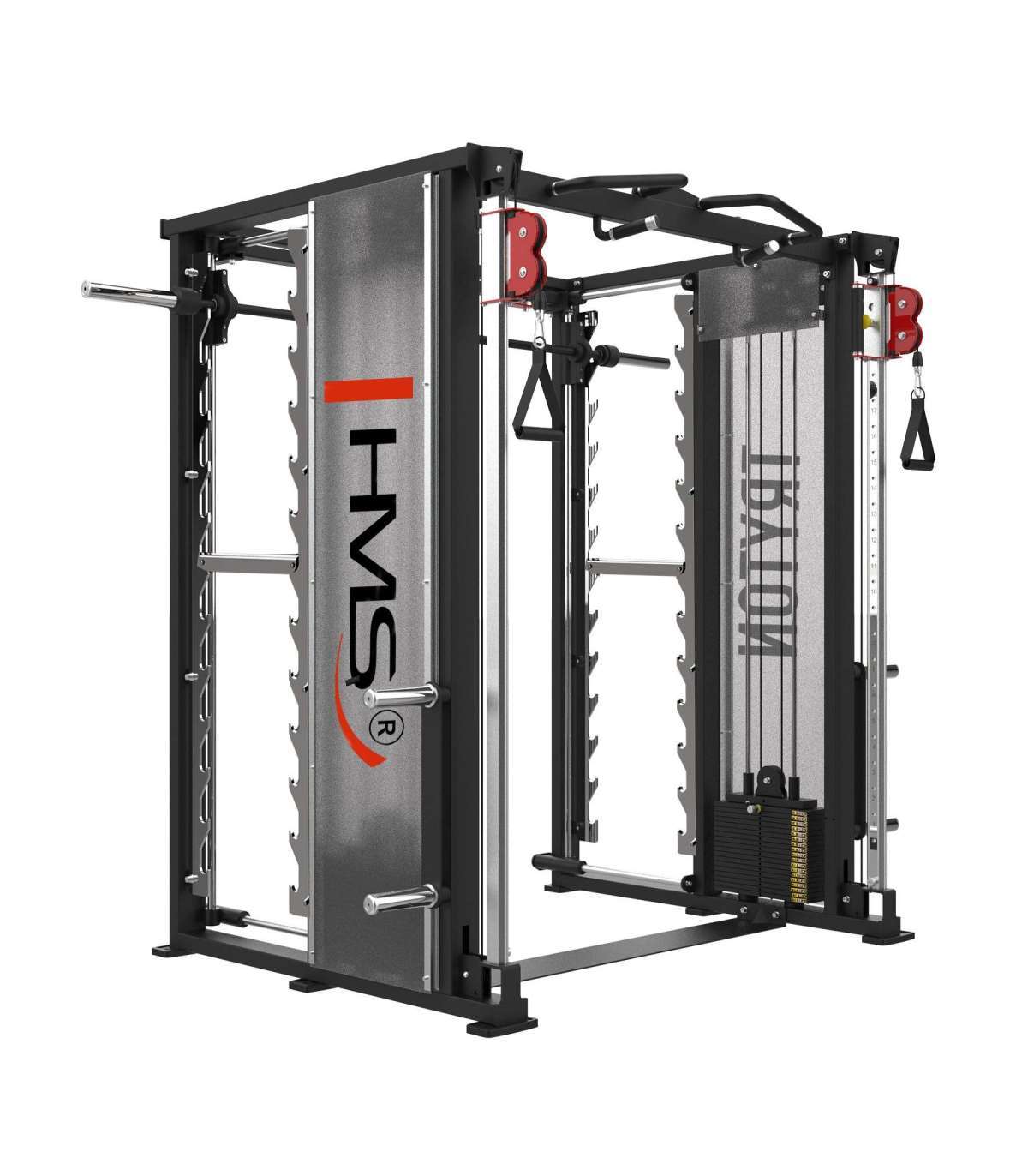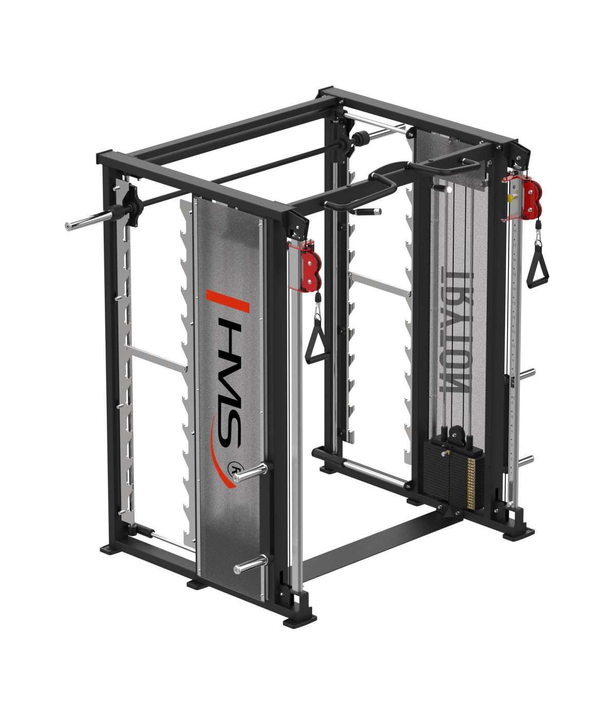 TRYTON SMITH MACHINE 3D WITH DUAL PULLEY AND WEIGHT STACK COMMERCIAL HMSThe Tryton by HMS Fitness is an advanced training atlas designed for commercial use, which stands out for its state-of-the-art features such as the 3D Smith crane. This equipment has been designed to meet the expectations of the most demanding users, offering a wide range of training possibilities.Smith crane 3D - Full freedom of movementTryton's innovative 3D Smith crane is a solution that takes classic exercise to the next level. Unlike traditional models that only move vertically, the 3D crane allows movement both up and down, as well as forward and backward. This allows the exerciser to perform more natural and functional movements, engaging more muscles and improving coordination and stability during training.Double liftThe Tryton features a 2 x 90kg double stack lift, with adjustable handle heights in 21 positions. This allows users to precisely adjust the lift settings to suit their needs, performing a variety of exercises for the upper and lower muscles. This flexibility makes the atlas ideal for a comprehensive full-body workout.MultifunctionalityIn addition, the Tryton features a pull-up bar with a variety of grip options for versatile back, shoulder and abdominal training. Four load pins allow for convenient storage of the plates, keeping the training area tidy. Convenience of use and practical solutions make this overhead crane an indispensable tool in any training space.Safety at the highest levelThanks to its robust construction and innovative solutions, the Tryton guarantees complete safety even during intensive workouts. The safety supports at the 3D Smith crane increase belaying, and the precise system of hanging the barbell on 12 hooks ensures comfort of use. The stability of the equipment and attention to detail make Tryton the ideal choice for fitness clubs that focus on quality and modernity.Specification:Dimensions