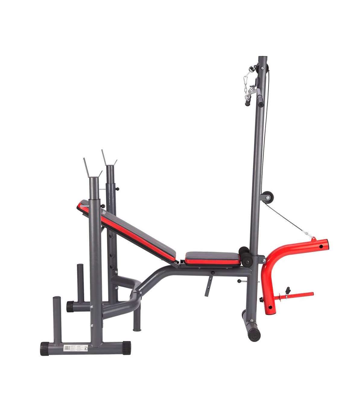 LS7206 HMS is a bench with a preacher pad, leg press, and upper pulldown designed for training with a barbell, dumbbells, and weights.Quality: The bench is made of the highest quality materials. Its solid construction, with wide profiles that are 7.5 cm thick, provides safety and stability during exercise. The bench is wide and covered in soft eco-leather, making it comfortable and convenient for training. The leg press is covered with thick foam, which reduces the risk of abrasion during exercises. Additionally, the LS7206 features an easy-to-use system for changing the incline of the bench, allowing for rapid adjustments.Functionality: The equipment is equipped with height adjustment for the racks, preacher pad, backrest, seat, and leg press. The preacher pad can be easily converted into an upper pulldown, allowing for exercises targeting the back, chest, arms, triceps, biceps, forearms, shoulder girdle, and legs. Unused elements (preacher pad or pulley) can be stored in one of two holders located at the back of the bench.The equipment offers a very wide range of possible exercises, including:Bench pressIncline bench pressPulling the upper pulleyStraightening the arms using the upper pulleyPulling straightened arms using the upper pulleyBicep curls with the preacher padLeg extensions with the leg pressLeg curls in a lying position with the leg pressAnd many more.Note: the set does not include a barbell and weights.Specifications:Solid steel constructionProfiles 7.5 cm thickComfortable, eco-leather-covered seatComfortable leg press covered with thick foamLeg pressAnti-slip handles15 cm wide foam pads for the leg press23 cm plate holderRack spacing: 93 cmDimensions (unfolded):Length: 198 cmWidth: 109 cmHeight (without upper pulley): 138 cmHeight (with upper pulley): 190 cmSeat dimensions:Length: 37.5 cmWidth: 29.5 cmBackrest dimensions:Length: 75 cmWidth: 29 cmPreacher pad dimensions:Length: 48 cmWidth: 33 cmUpper pulley dimensions:Height: 135 cmBar width: 97 cmHandle width: 12 cmHandle diameter: 3 cmMaximum product load: 200 kgFeatures:4-step adjustment of the backrest incline angle: -10 to 40 degrees3-step adjustment of the seat angle: 0-40 degrees4-step adjustment of the rack height for the barbell (with clamps)4-step adjustment of the preacher padUpper pulleyAllowable loads:On the leg press: 45 kgOn the preacher pad and pulley: 45 kgRemarks:Not for commercial use.Warranty: 24 months.Importer: Abisal Ltd. | Poland | 41-807 Zabrze | Pyskowicka Street 17 | e-mail: abisal@abisal.plAbisal Ltd.. declares that the products sold by the company are safe and meet the requirements contained in the Act on General Product Safety of December 12, 2003. (Journal of Laws of December 31, 2003)
