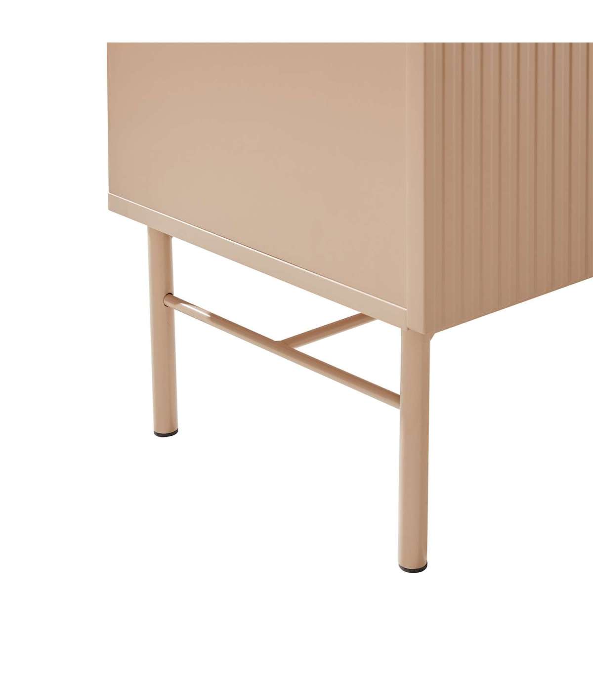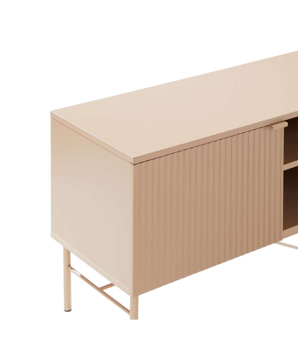 TV laud SEQUENCE 2-ukse ja avatud riiuliga 150x40xH55cm, cappuccino. TV laua korpus on valmistatud MDF plaadist. Reljeefse pinnaga triibulised uksepaneelid annavad lauale omanäolise ja trendika välimuse. TV laud on viimistletud vastupidava polüuretaanvärviga. Metallist alusraam ja jalad on viimistletud pulbervärviga.