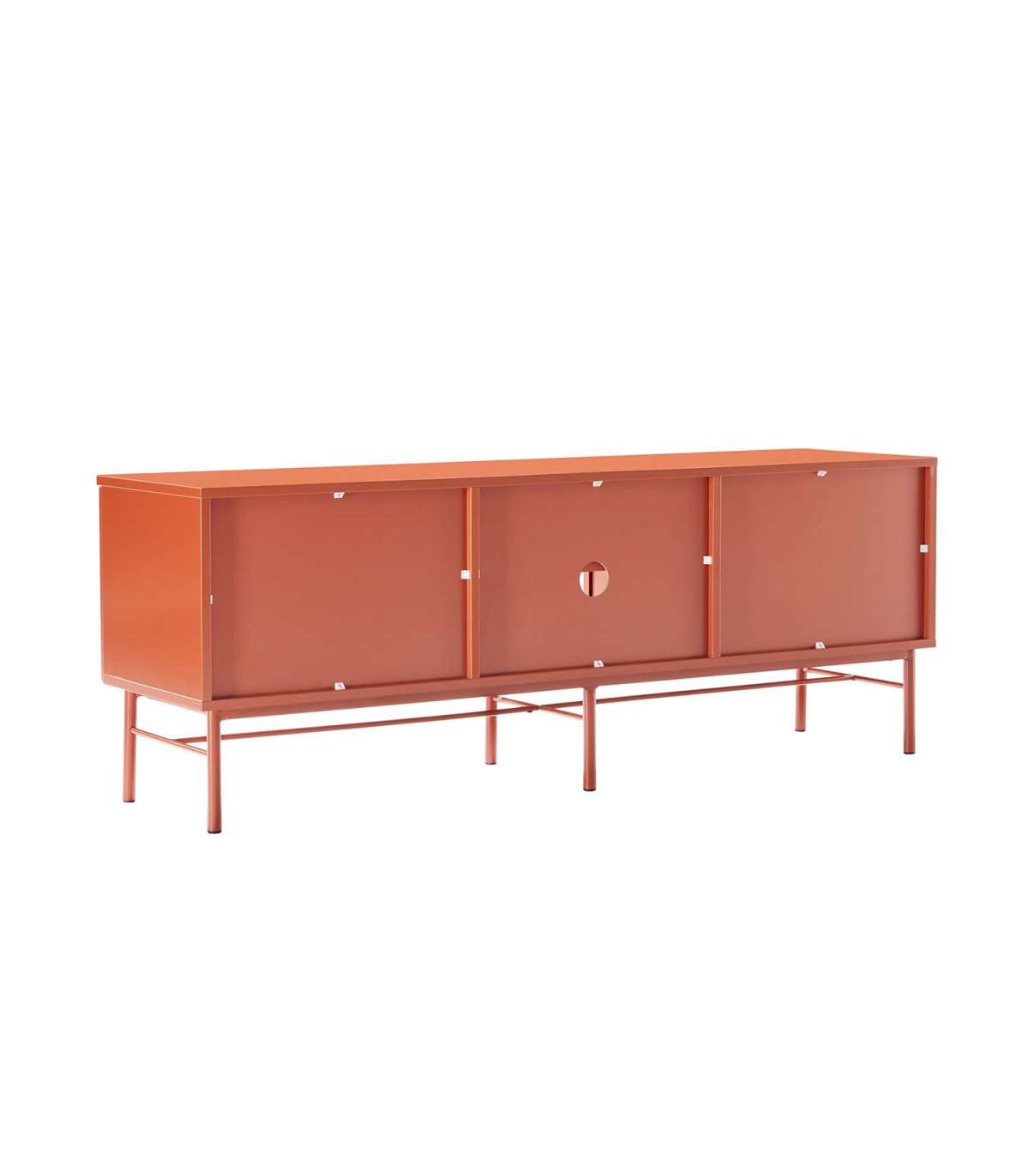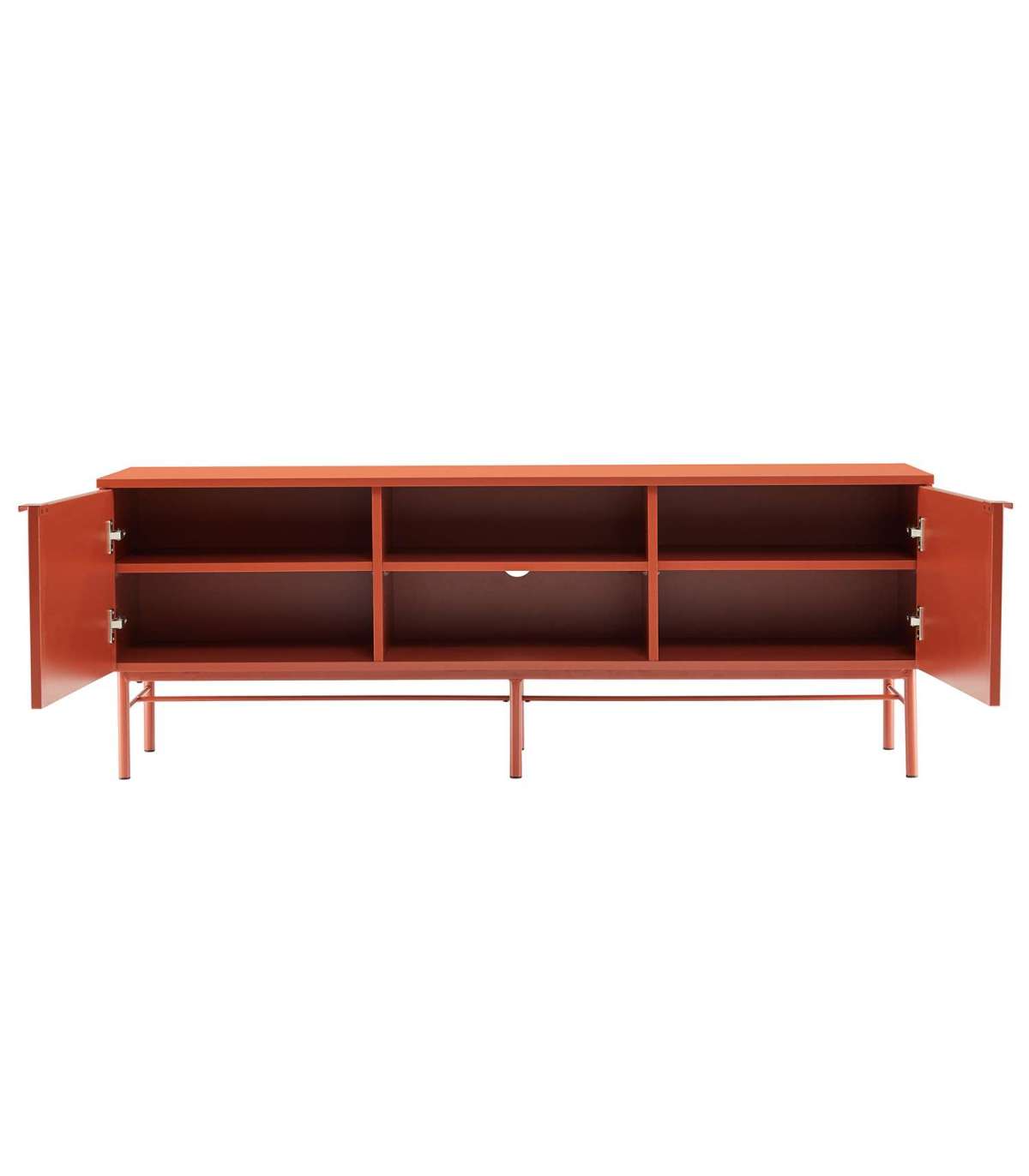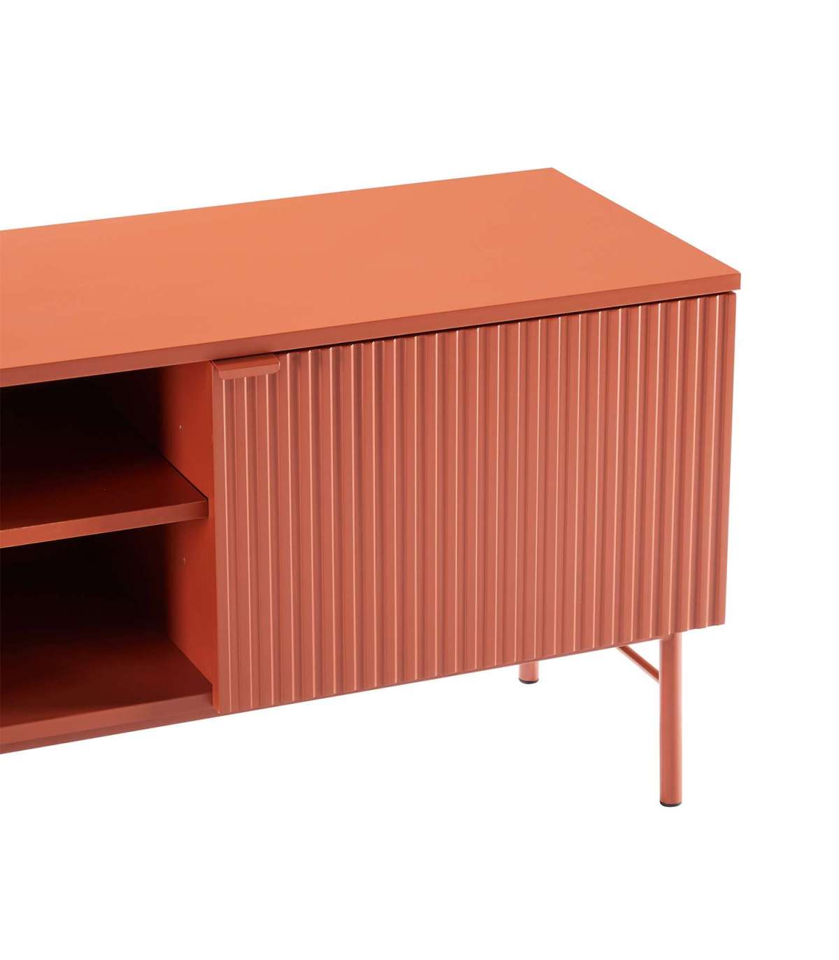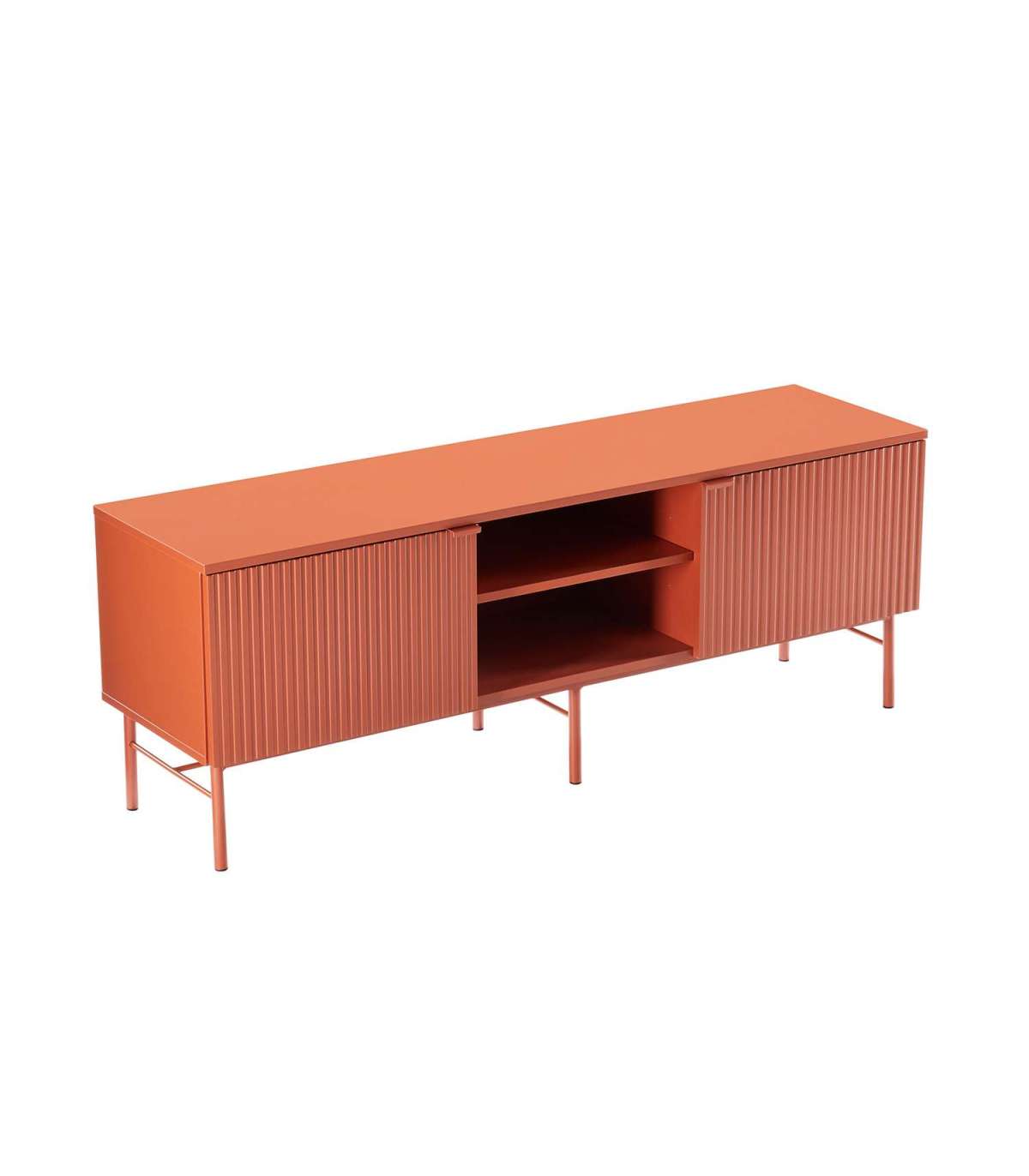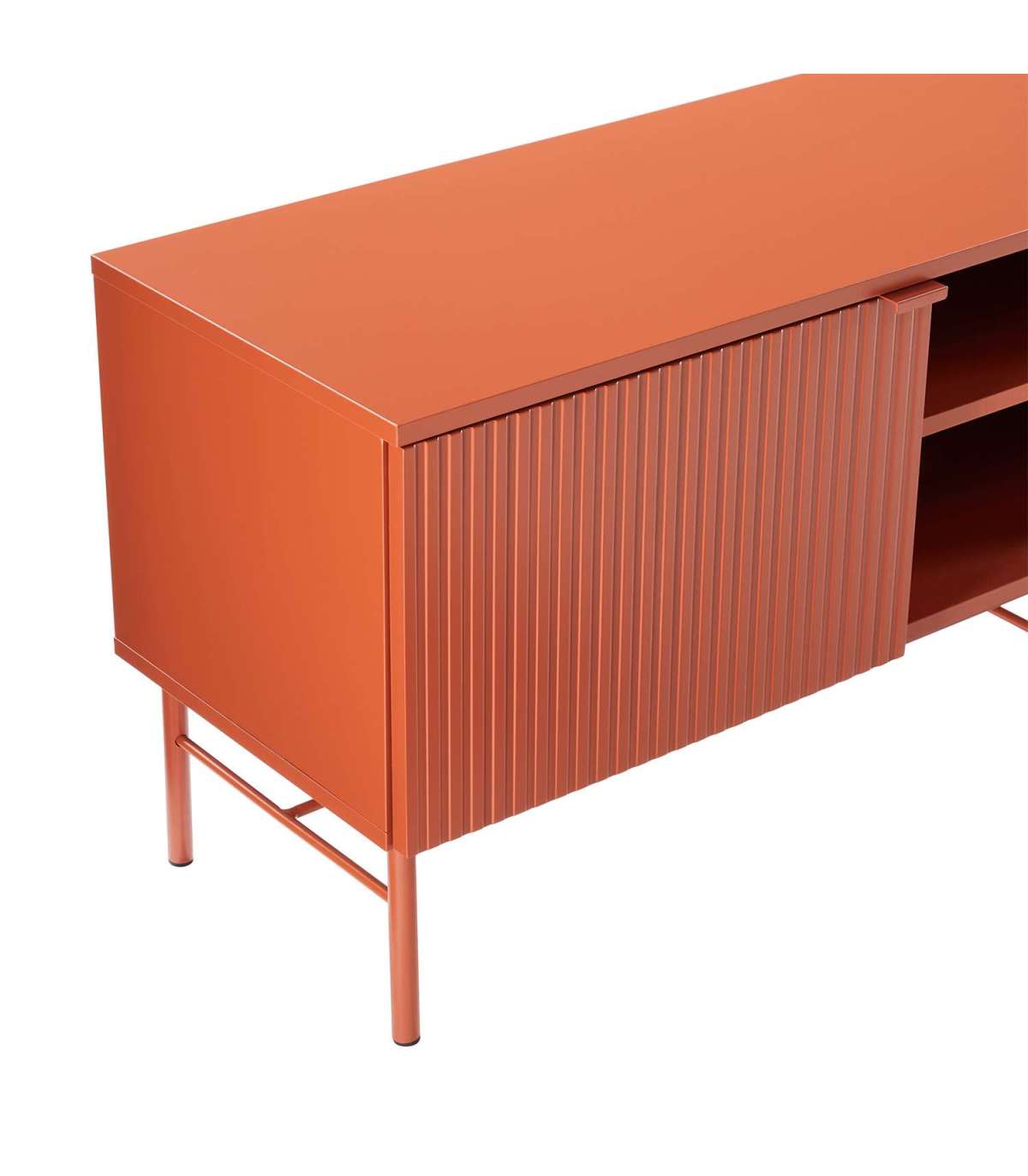 TV laud SEQUENCE 2-ukse ja avatud riiuliga 150x40xH55cm, sügispruun. TV laua korpus on valmistatud MDF plaadist. Reljeefse pinnaga triibulised uksepaneelid annavad lauale omanäolise ja trendika välimuse. TV laud on viimistletud vastupidava polüuretaanvärviga. Metallist alusraam ja jalad on viimistletud pulbervärviga.