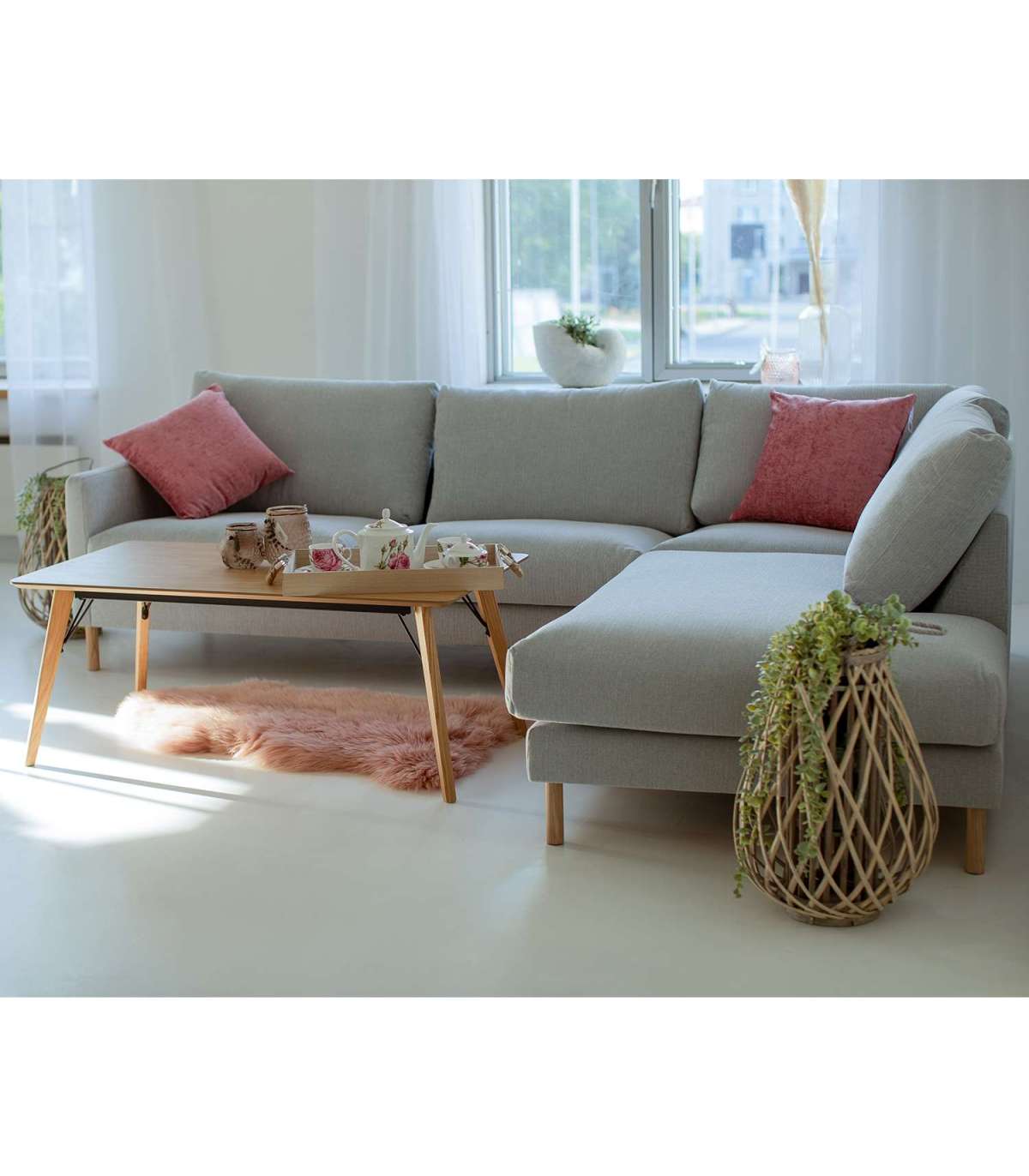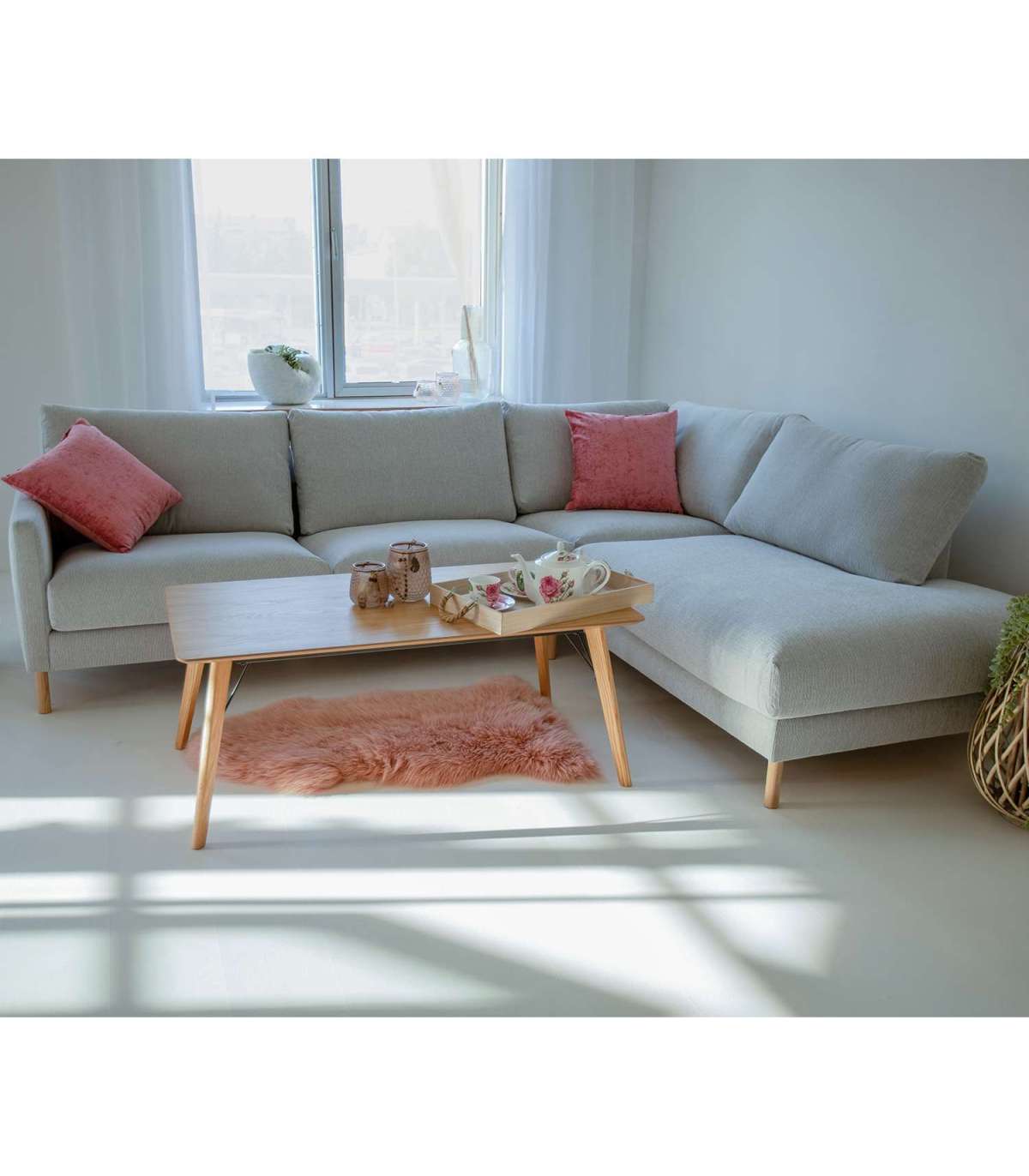 Угловой диван LISANNA RC серый. Диван обтянут серой полиэстеровой тканью. Подушки сиденья и спинки изготовлены из пеноматериала. Подушки имеют съемные чехлы. Ткань Martindale 30 000. Каркас изготовлен из массива дерева, фанеры, ДВП и ДСП. Каркас покрыт поролоном. Диван имеет зигзагообразную подвеску. Ножки дивана изготовлены из дуба. Высота сиденья 46 см, глубина 57 см. Размеры изделия 260x90/205xH80см. Продукт произведен в Литве.