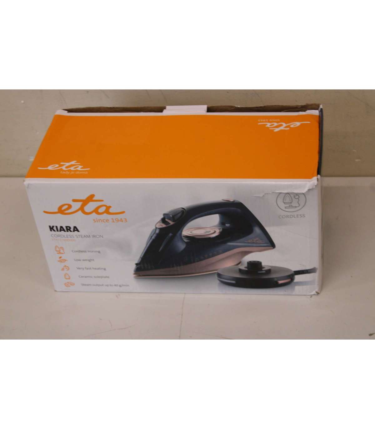 SALE OUT. ETA ETA127690000 Kiara Iron, Ceramic, 2200 W, Water tank 220 ml, Black | ETA | Iron | Kiara ETA127690000 | Cordless Steam Iron | 2200 W | Water tank capacity 220 ml | Continuous steam 40 g/min | Steam boost performance 90 g/min | Black | DAMAGED PACKAGING, BROKEN WATER CUP, SCRATCHED, SCRATCHED PAINT FROM FRONT OF IRON