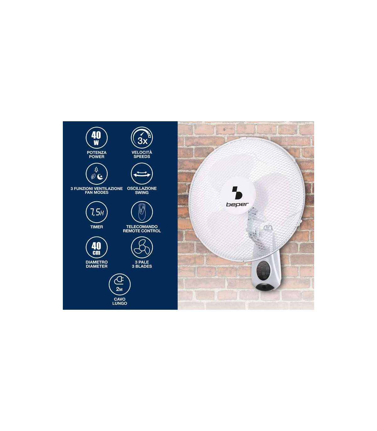 Seinaventilaator on eriti kasulik kuumadel suvepäevadel halva ventilatsiooniga ruumides või kontorites. Tänu seinale kinnitamisele sobib see suurepäraselt ka väikestesse ruumidesse, kuna ei võta põrandapinda ja tagab parema õhuringluse. 3 kiirust ja 3 ventilatsioonirežiimi, reguleeritav taimer kuni 7,5 tundi ja automaatne horisontaalvõnkumine, kõik valikus ja reguleeritav kaasasoleva puldi abil. 2-meetrine kaabel lihtsaks paigaldamiseks.
