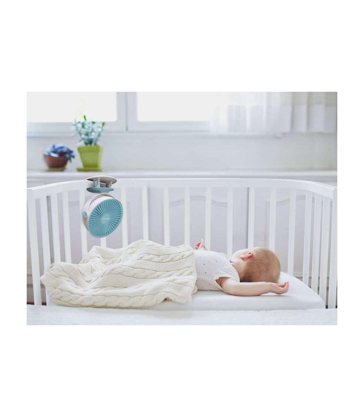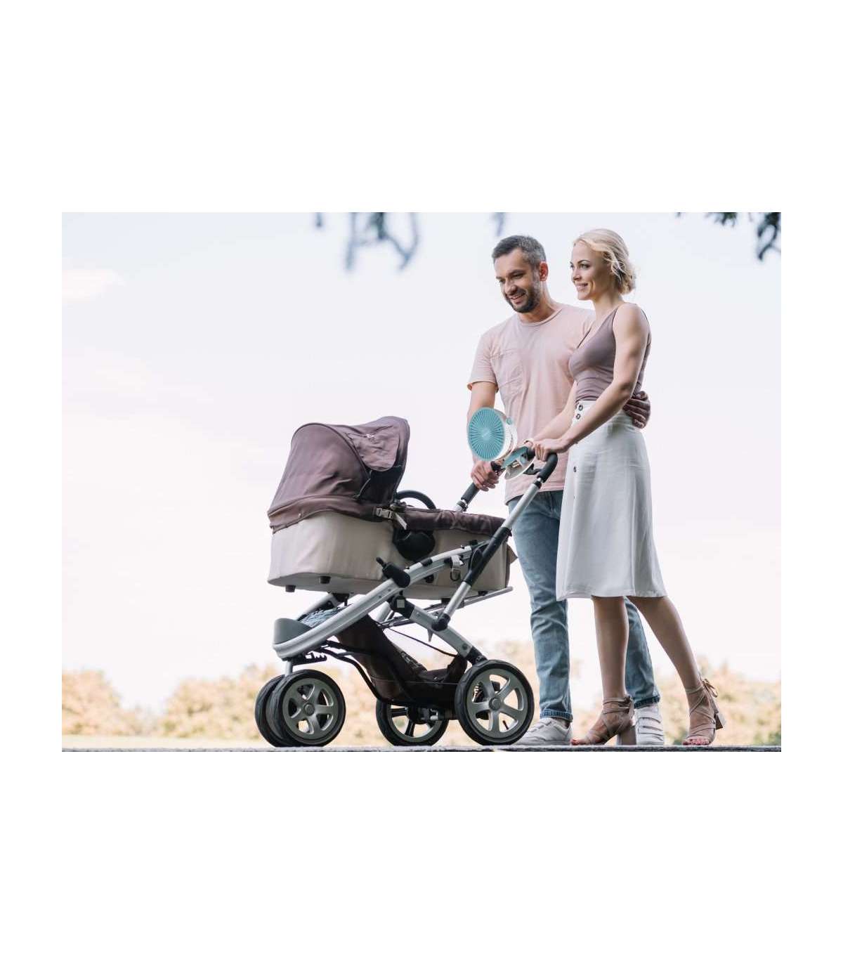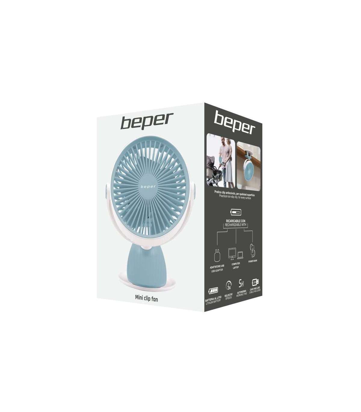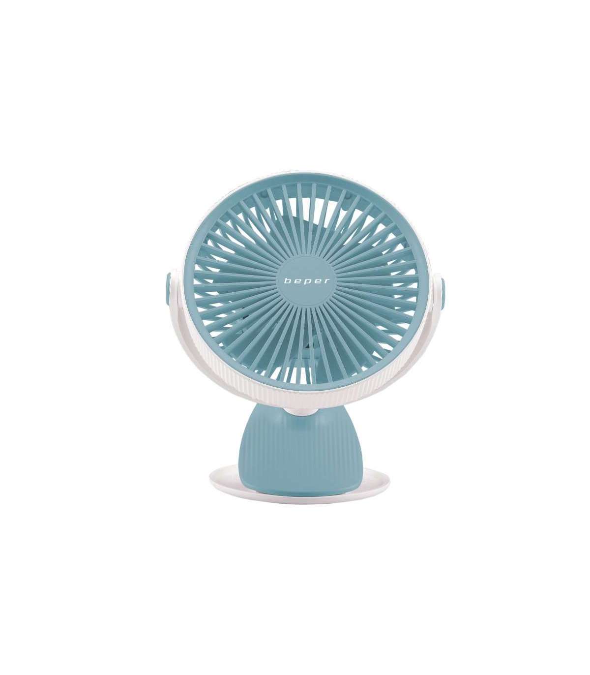 ABS-ventilaator, millel on 5-teraga mini-ventilaator, mida kaitseb Ø 14,5 cm võre ja praktilise kinnitusega, mida saab kinnitada mis tahes pinnale, näiteks lauadele, riiulitele või lapsevankritele. Võrgutoide või laetav töö tänu kaasasolevale USB-kaablile ja liitiumakule, mis võimaldab seadmel töötada autonoomselt kuni 5 tundi. LED-indikaator, 3 valitavat kiirust ja reguleeritav kaldenurk. Ideaalne tee või ranna jaoks.