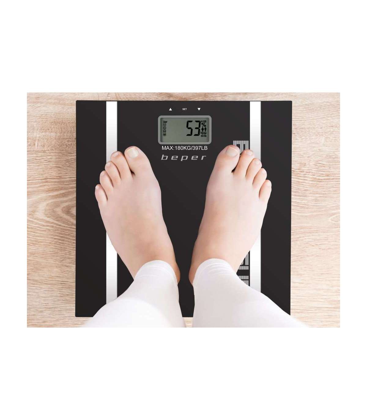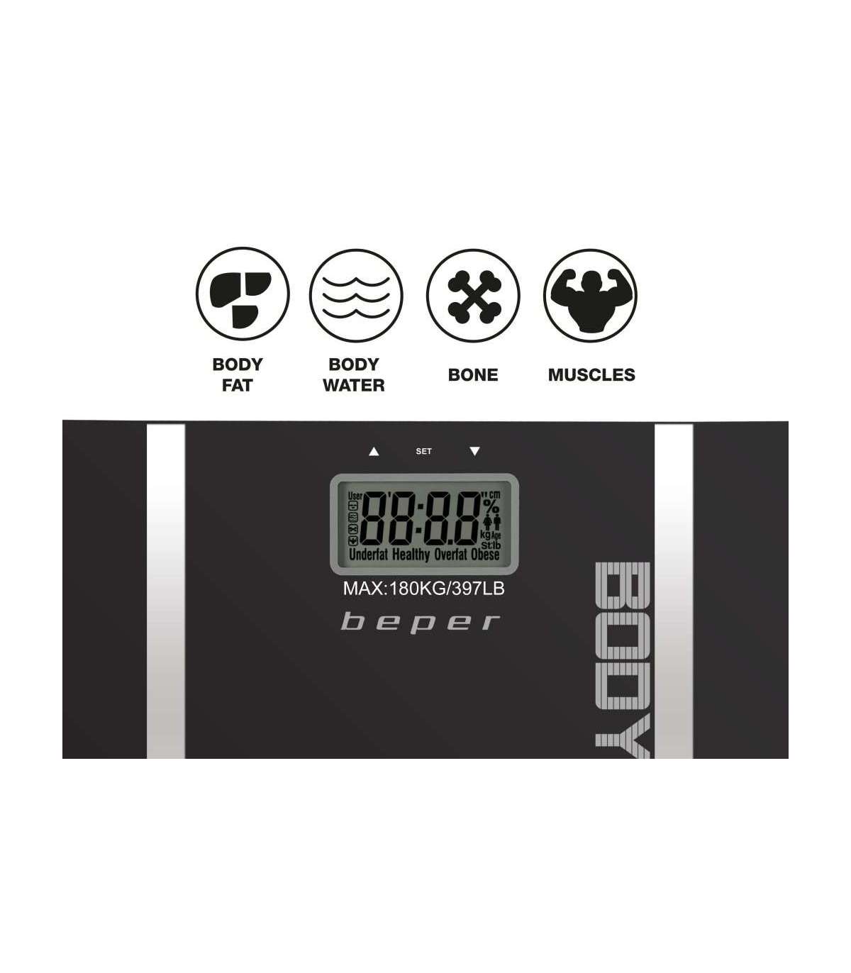 Elektroonilised vannitoakaalud 6 mm paksuse karastatud klaasist platvormiga. Tänu metallist sisestustele arvutab see teie andmeid sisestades lihaste ja luude massi, vedelike protsendi, mahutavusega kuni 10 mälu. Maksimaalne koormus 180 kg. LCD ekraan. Automaatne välja- ja lähtestamine koos ülekoormuse ja aku taseme näiduga. Kaasas aku.
