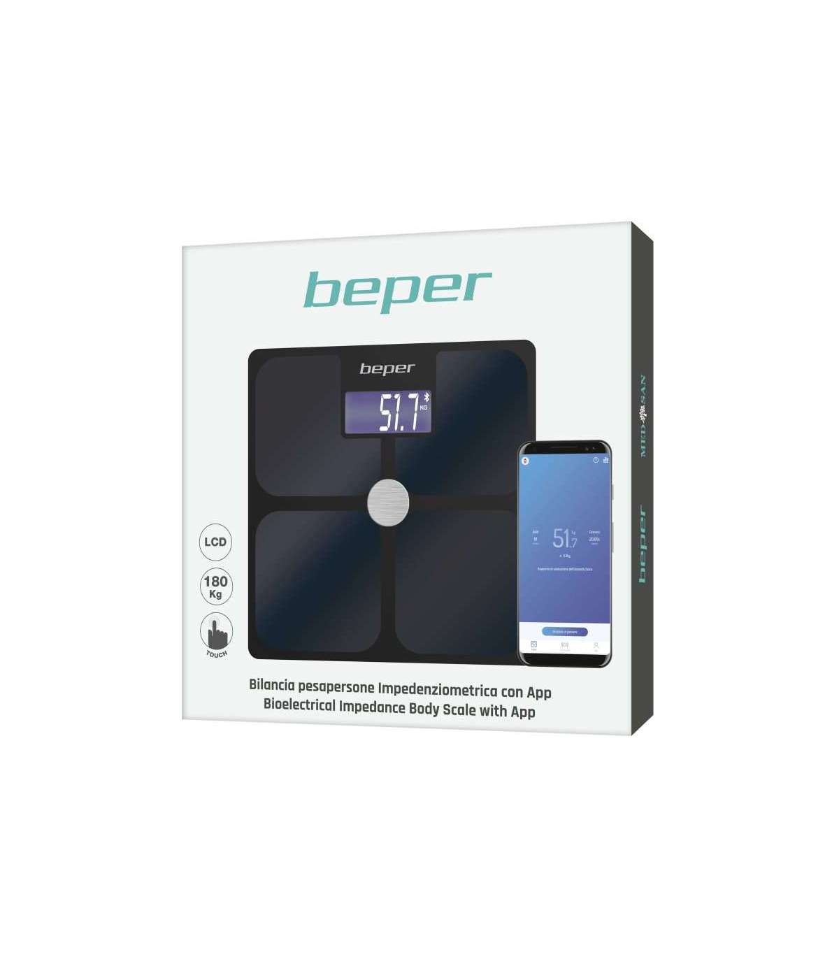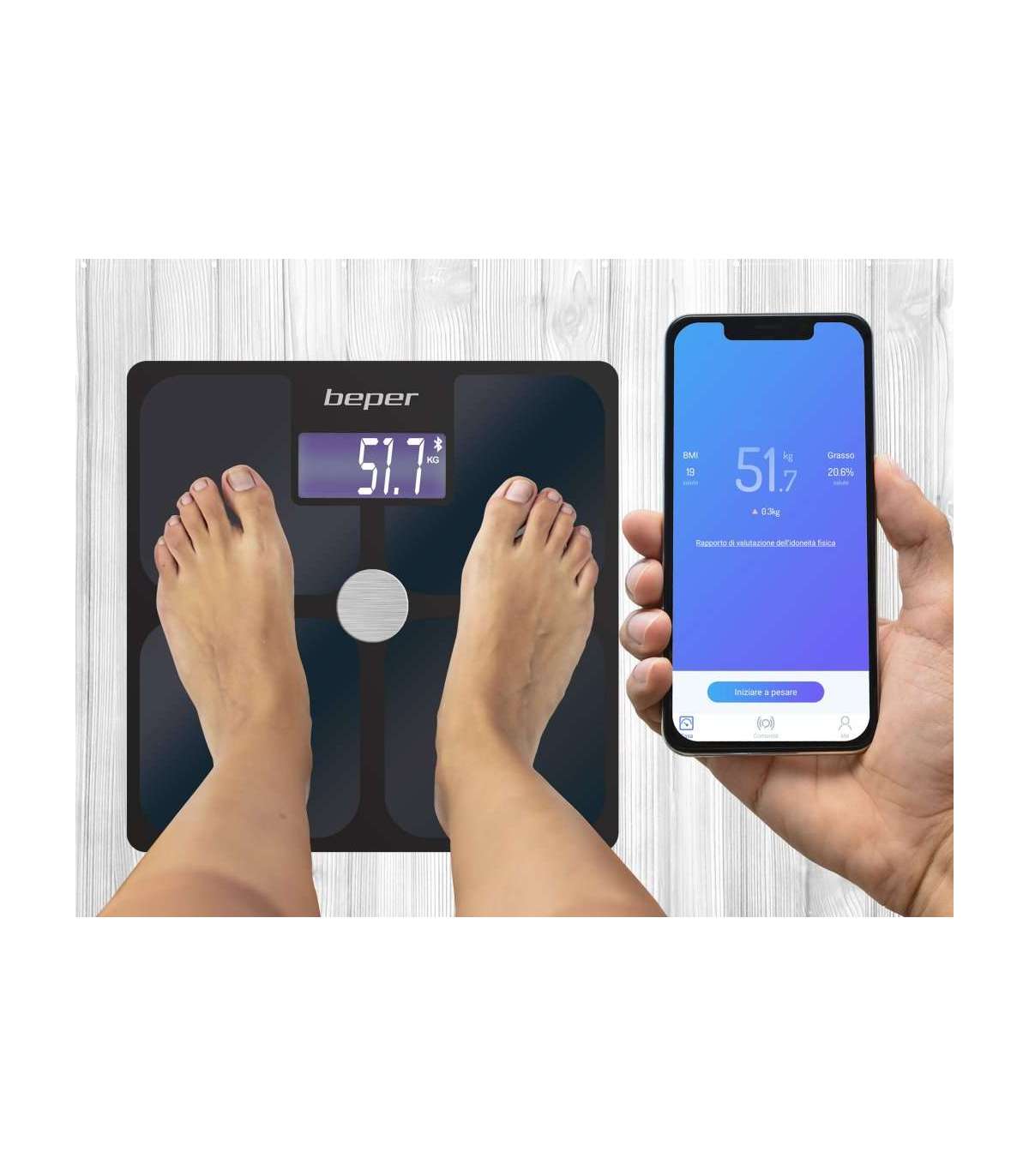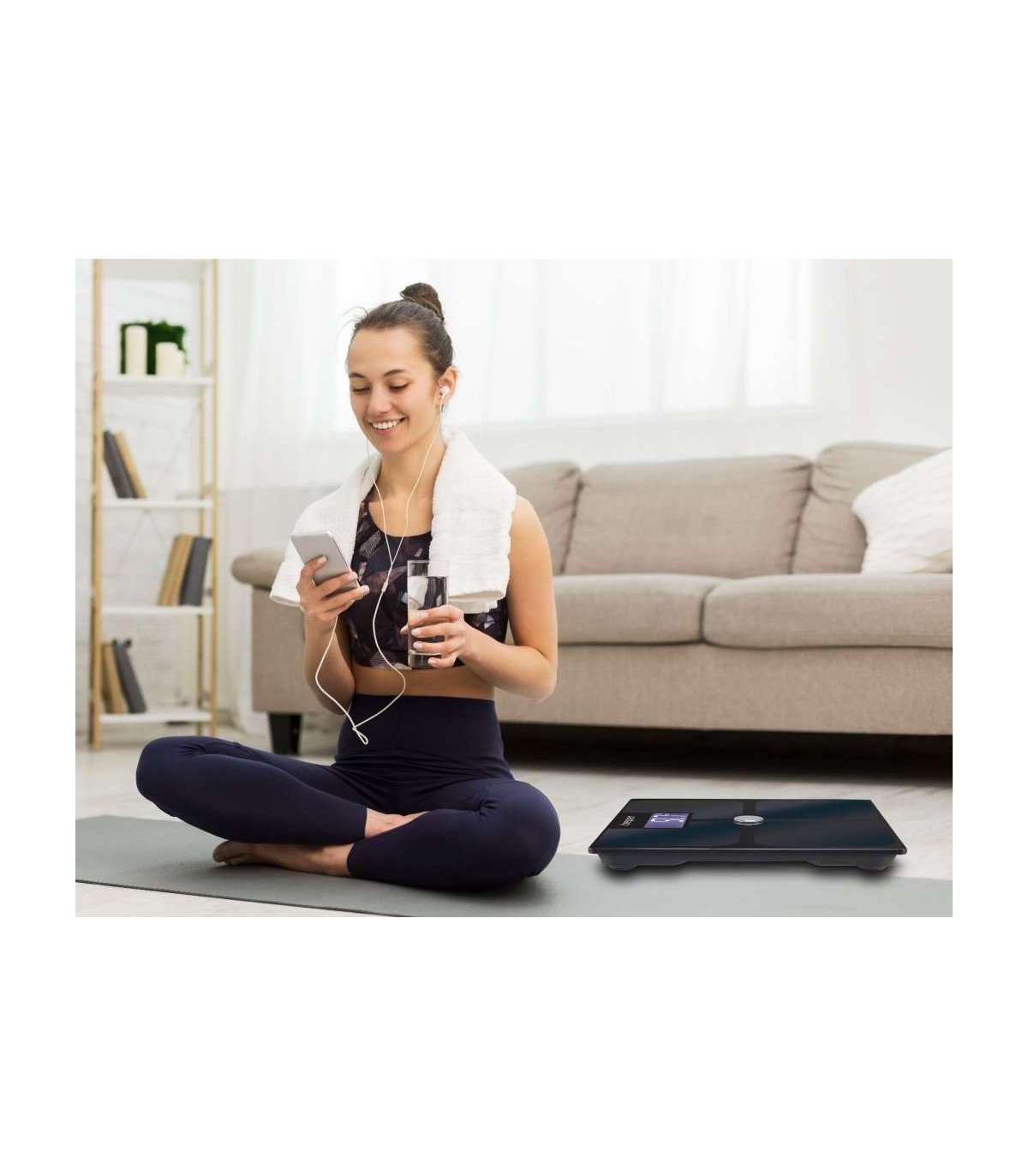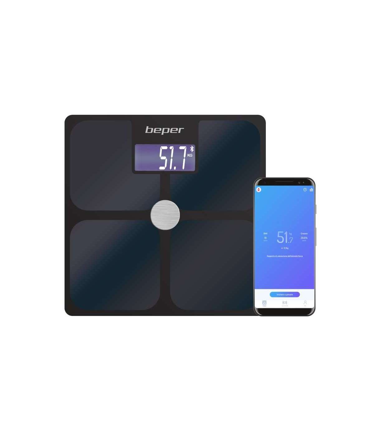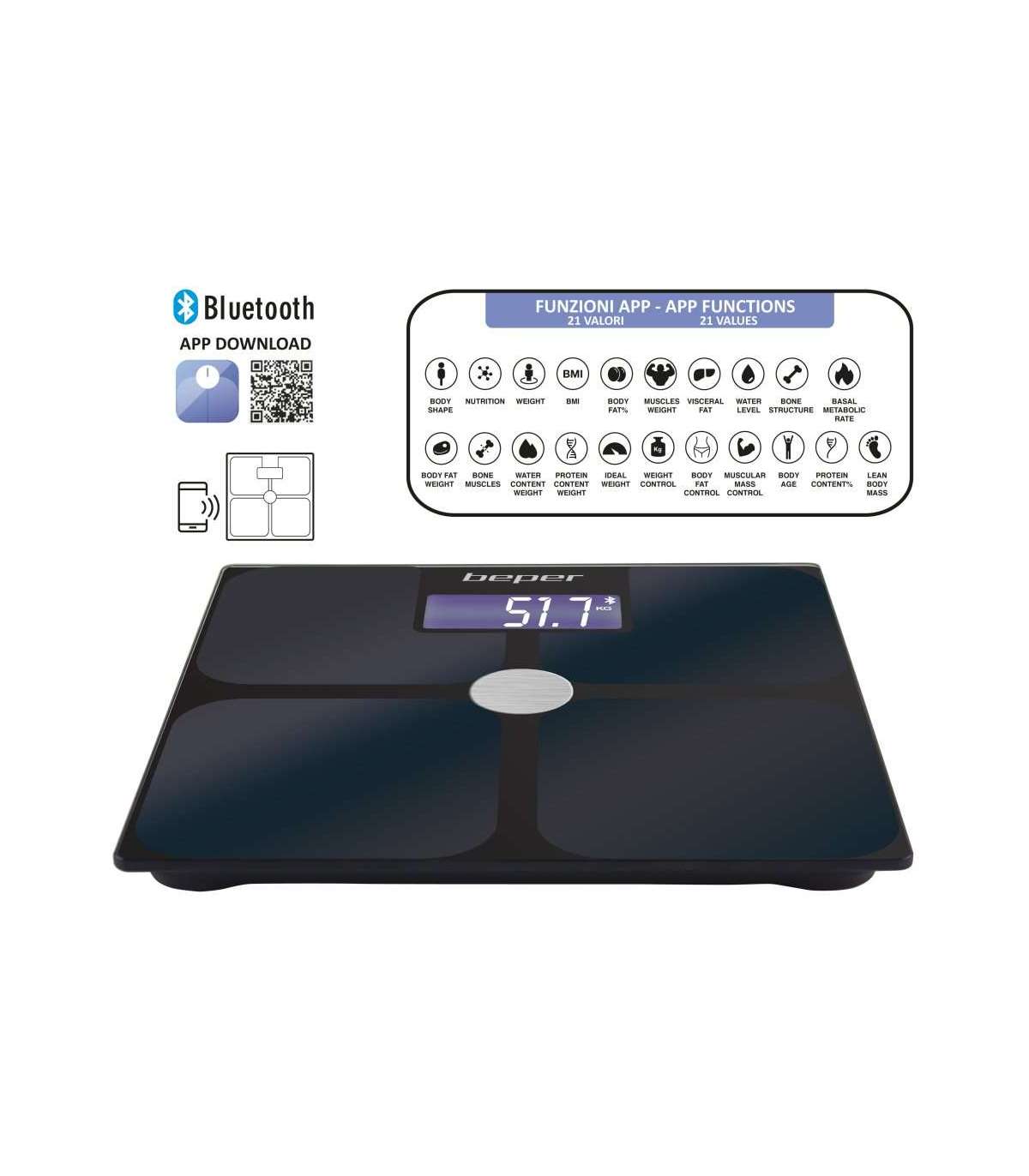 Elektriline impedantsi kehakaal, mis mõõdab 21 keha indikaatorit: kehakuju, toitumine, kaal, BMI, rasvamass, lihasmass, vistseraalne rasv, veetase, luud, põhiainevahetus, kaal Rasvamass, skeletilihas, vee kaal, valgu kaal, ideaalne kaal, kaalukontroll, kontrollrasv, lihaste kontroll, kehaaastad, % valk, lahja mass. Karastatud klaaspaneel on kaetud indiumtinaoksiidi elektroodidega (ITO – indiumtinaoksiid), mis on äärmiselt tundlik ja suudab kiiresti ja suure täpsusega tuvastada keha koostist. Sisseehitatud Bluetooth-tehnoloogia andmete edastamiseks otse teie nutitelefoni rakenduse Scaleup kaudu (saadaval iOS-i ja Androidi jaoks) ning sünkroonimiseks rakendustega Google Fit, Fitbit ja Apple Health. Trendide jälgimiseks kogutud ajalooliste andmete statistika ja võimalus andmeid pdf-vormingus alla laadida. Mitu kasutajat kogu pere jaoks profiilide loomiseks ja kogukonnaga andmete jagamiseks. Mõõtmise täpsus. Puutetundlik süüde ja suur taustvalgustusega LCD-ekraan. Ülekoormuse ja aku tühjenemise indikaator, automaatne väljalülitus.