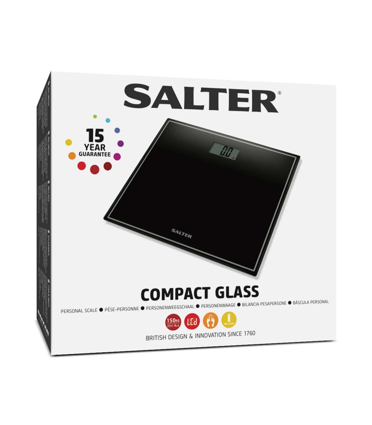 See stiilse karastatud turvaklaasi platvormiga disainitud Salteri kompaktsest klaasist vannitoakaal muudab kaalu mõõtmise imelihtsaks.