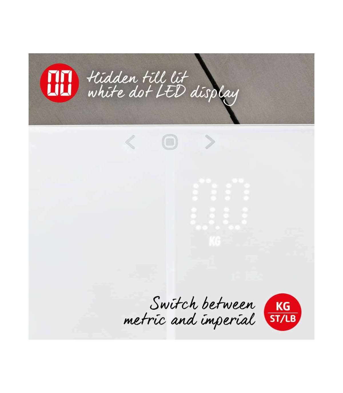 Sellel Salteri kaalul on hõlpsasti loetav ja kuni süttimiseni peidetud ekraan ning täpsed mõõtmised tollides ja meetrites kuni 180 kg.