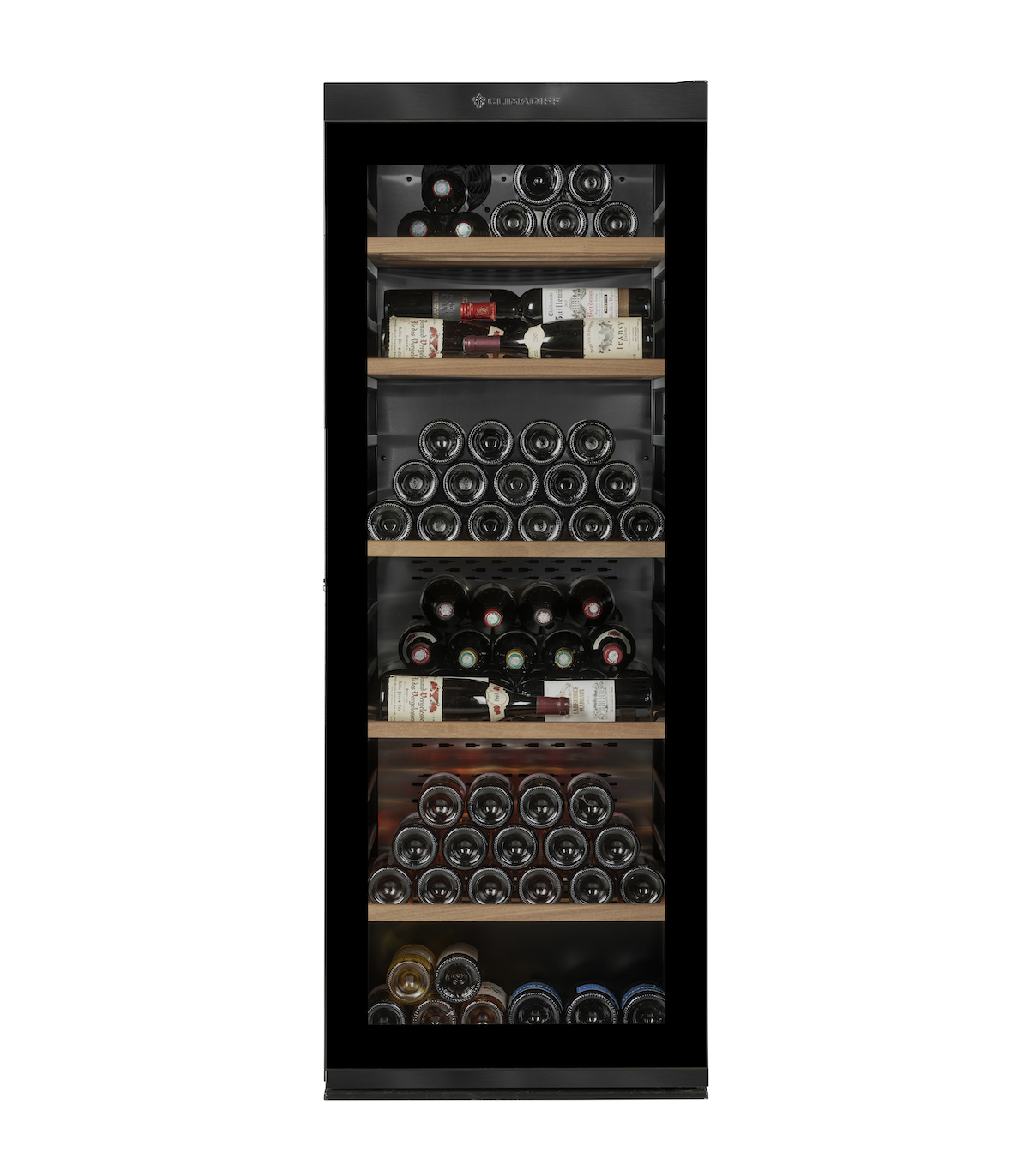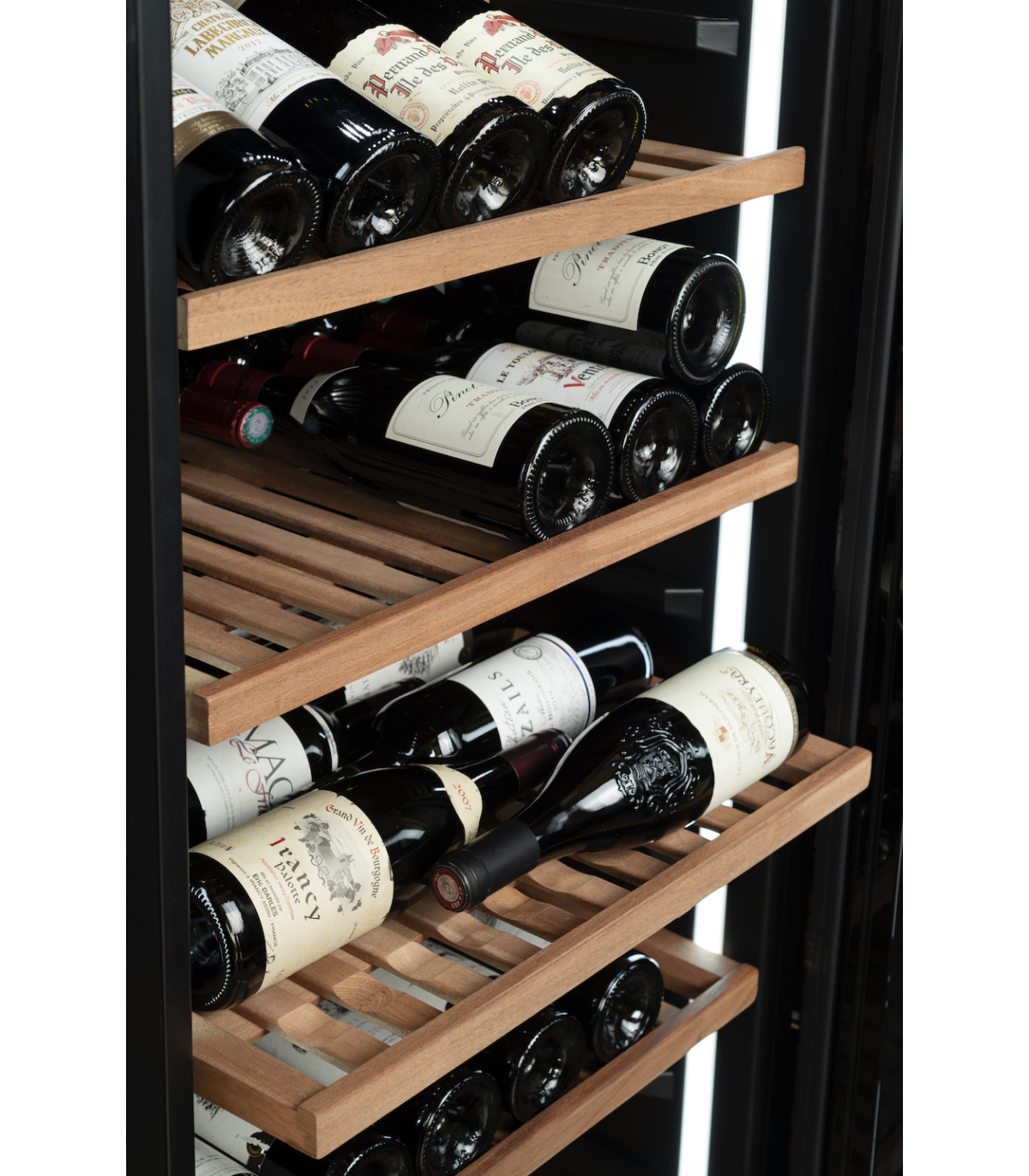 The shelves are sliding and have a safety device to prevent them from tipping over. Sapelli shelves are known for their ability to absorb vibrations, which guarantees optimal conservation of the wine by reducing the risk of turbidity. They also ensure a homogeneous air circulation for an efficient ventilation and a stable temperature in the whole cellar.