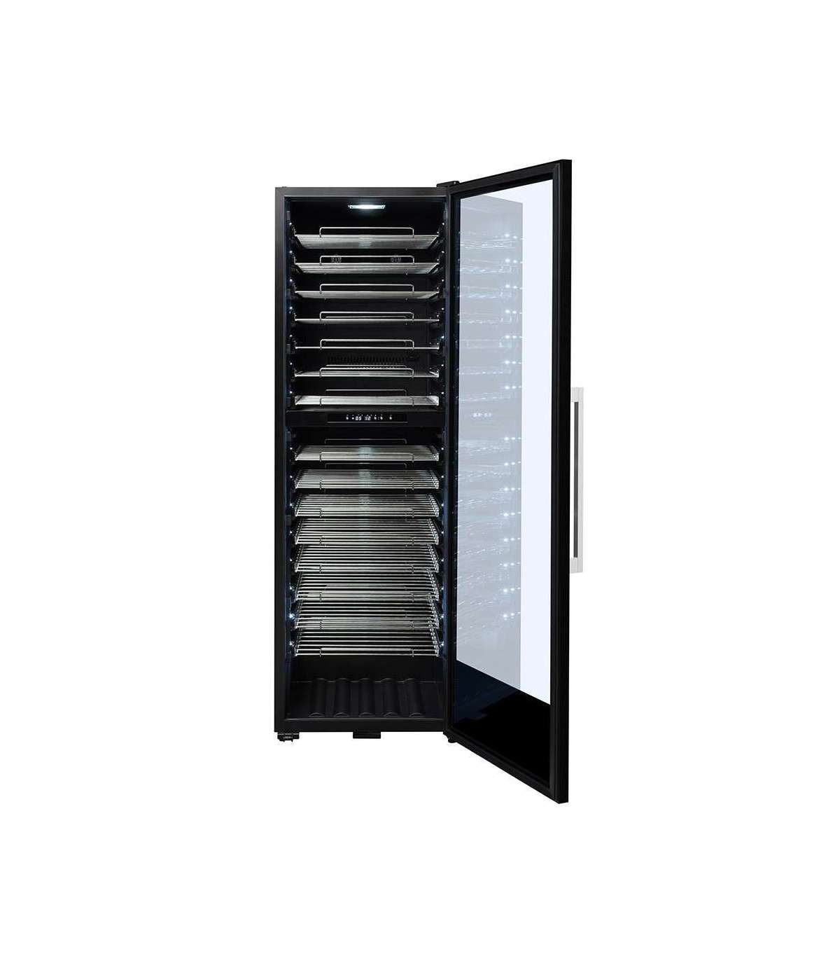Protected by a tempered glass door with anti-UV treatment, your bottles are visible and enhanced by interior LED lighting. The full glazed door and its removable plinth guarantee perfect integration. 2-layered gray-colored tempered glass.
