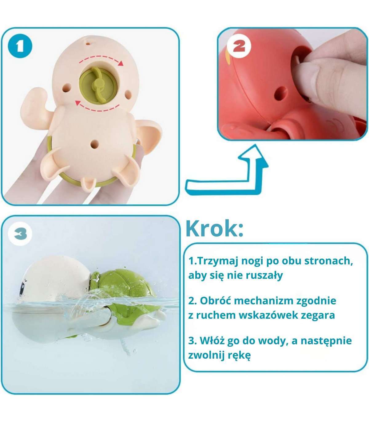- После погружения черепашка начинает шевелить ластами и плыть, обеспечивая ребёнку весёлое развлечение во время купания.
