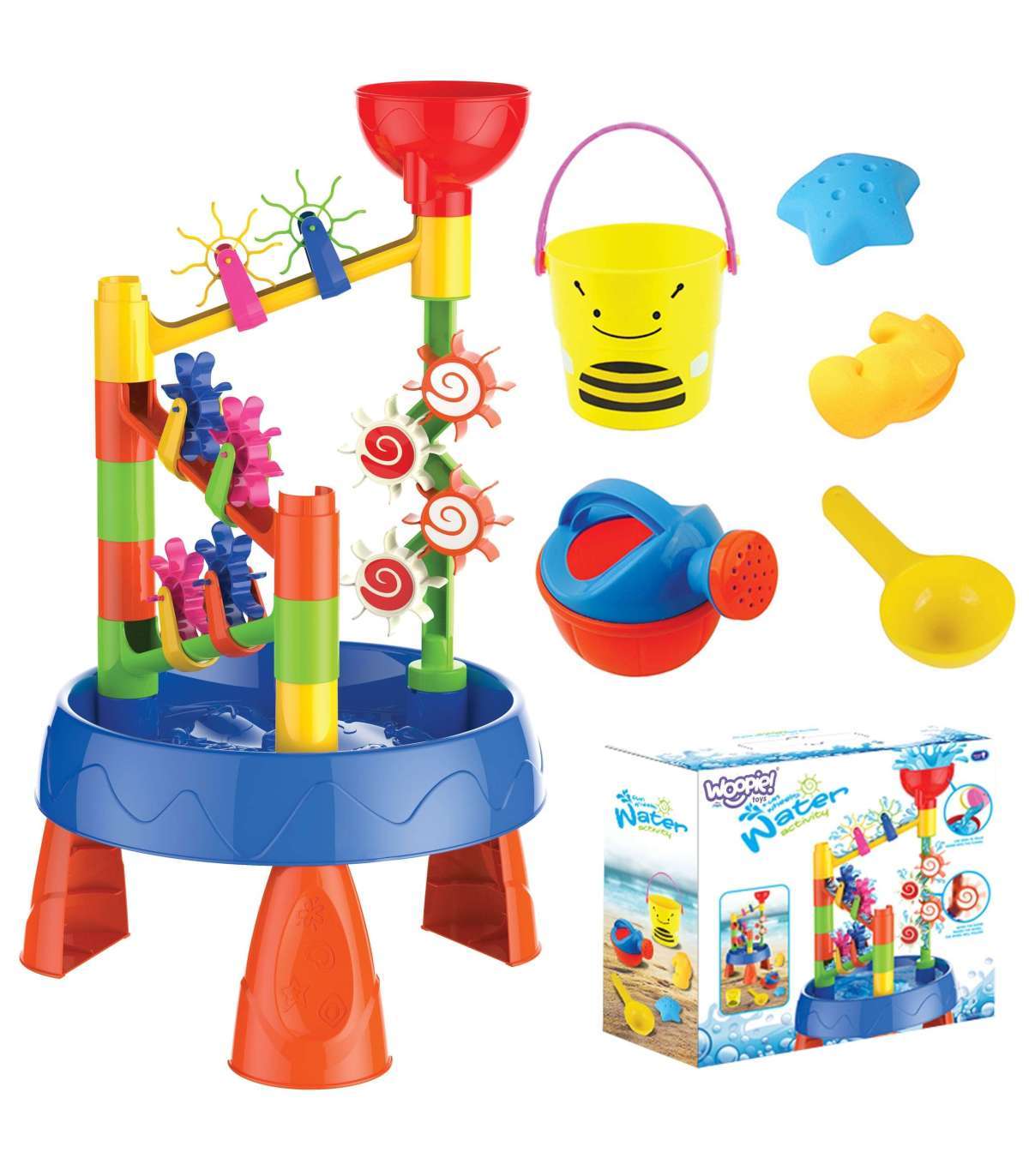2-в-1 водный стол и песочница от бренда WOOPIE — идеальная игрушка для игры с водой и песком. Набор включает 5 аксессуаров: формочки, лейку, ведёрко, ковш для воды. Стол оснащён интерактивными мельницами, которые вращаются при наливании воды в воронку. Набор предназначен для игры как дома, так и на улице. Идеально подходит для игры дома и на пляже или в песочнице.