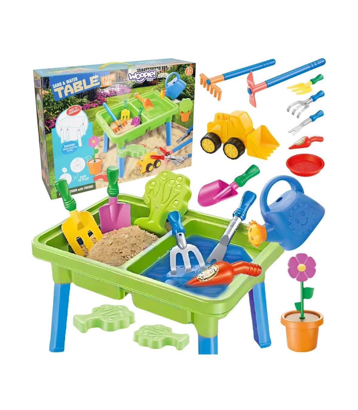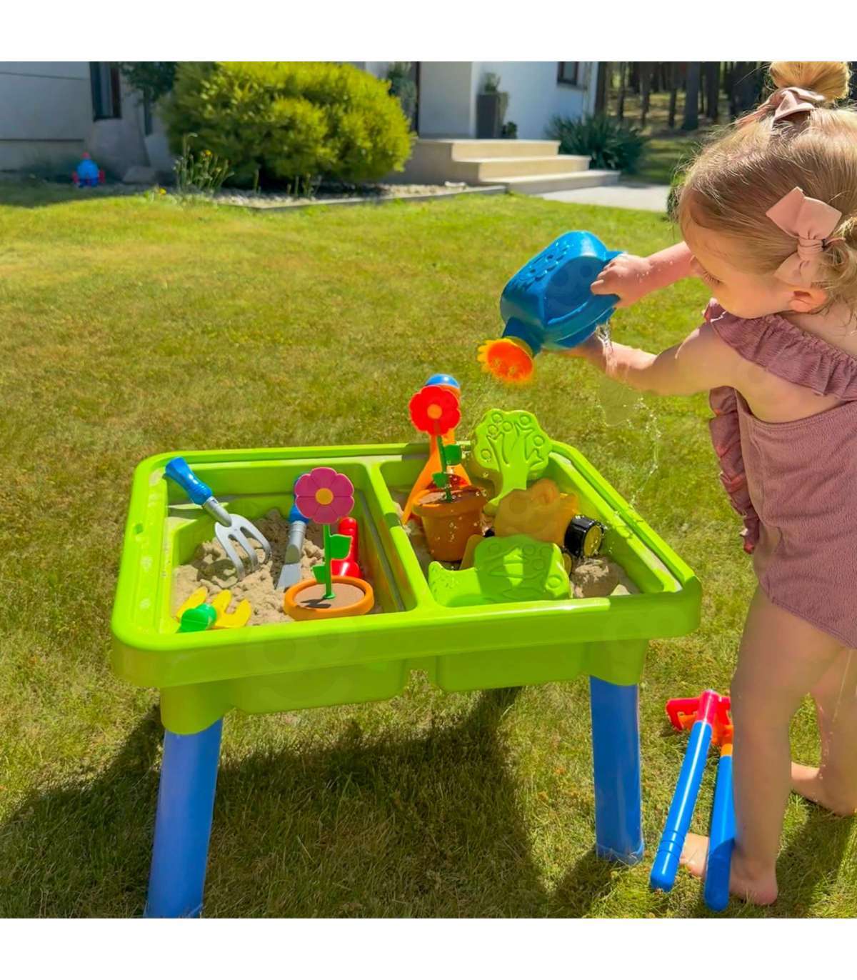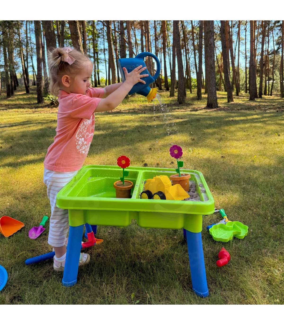 2-в-1 водный стол песочница от бренда WOOPIE — отличная игрушка, которая подарит детям бесчисленные часы игры с водой и песком. В комплект входит целых 13 разнообразных аксессуаров, таких как: формочка, лейка, экскаватор и две лопатки. Столик имеет две углубления – одно можно заполнить водой, другое песком, что позволяет творчески играть в любом месте. Набор идеально подходит как для дома, так и для пляжа или песочницы. Этот универсальный набор позволяет детям создавать неограниченные сценарии игр, стимулируя их воображение и развивая мелкую моторику. Идеален для творческой игры как в помещении, так и на свежем воздухе!