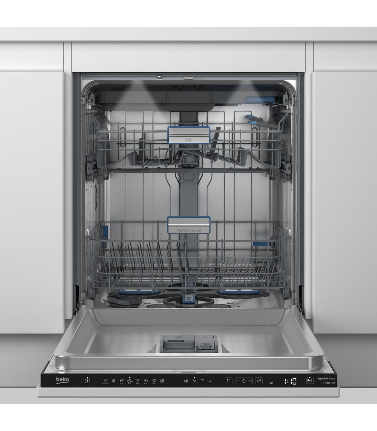 Maximum coverage, up to five times better cleaning results* The new PowerIntense technology for dishwashers exceeds all expectations compared to our previous advancements. Four satellite spray arms provide bi-directional movement and easy cleaning with every cycle. Efficient water spraying ensures that water always reaches even the hardest-to-reach places. The innovative spray arm system ensures effective residue removal. With PowerIntense, every zone is an intensive zone, leaving your dishes sparkling clean! *Based on test report and in-house cleaning score calculations according to international standards, compared with BEKO BBC 181 B comparison model featuring CornerIntense spray arms and pre-set load type program Intensive 70.