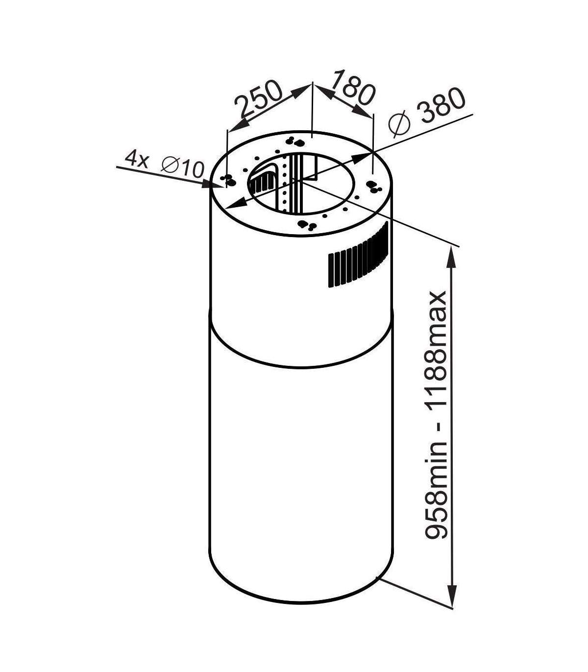 The cylindrical shap island cooker hood has a painted white finish and an adjustable fixation to set the perfect height.