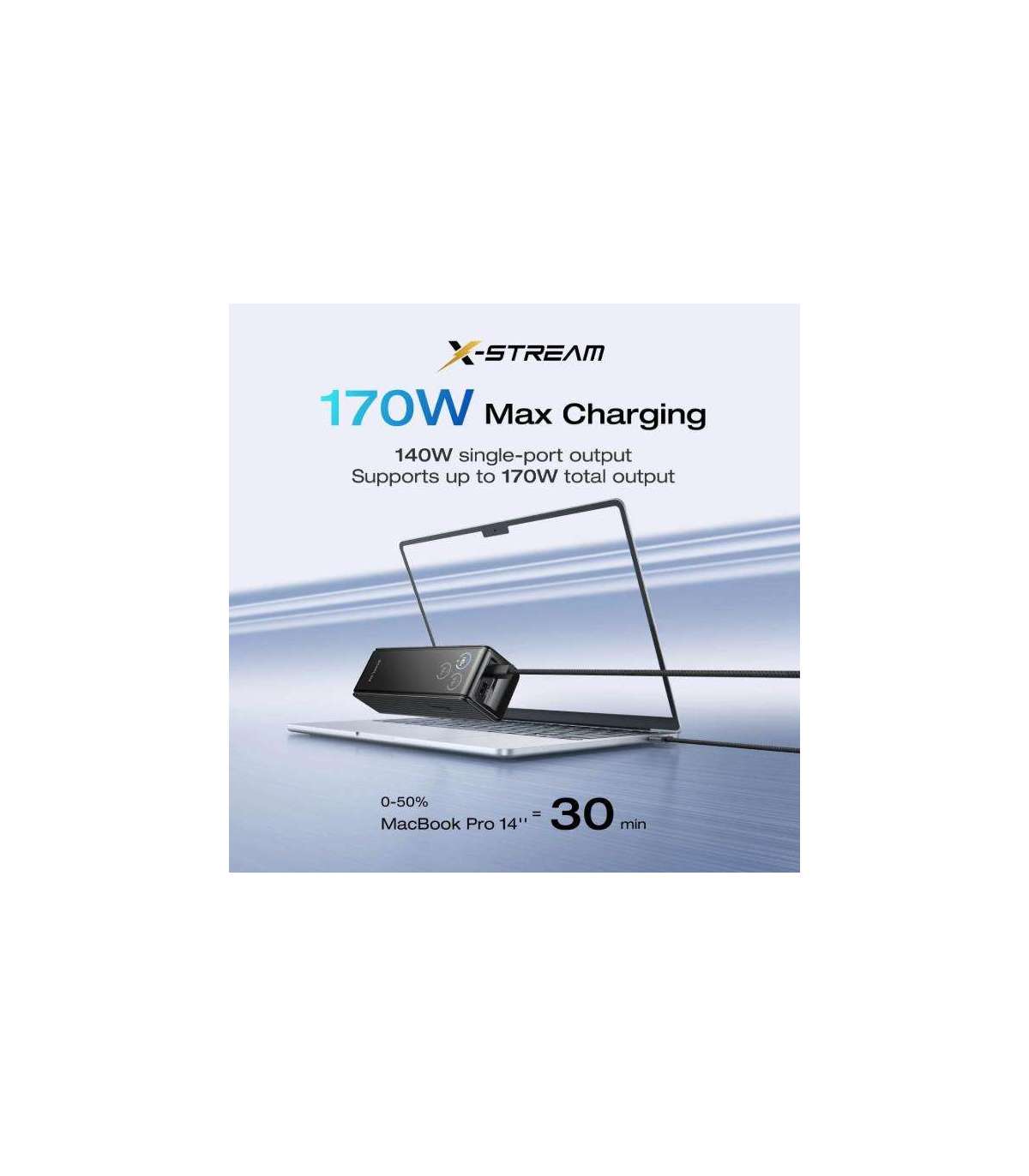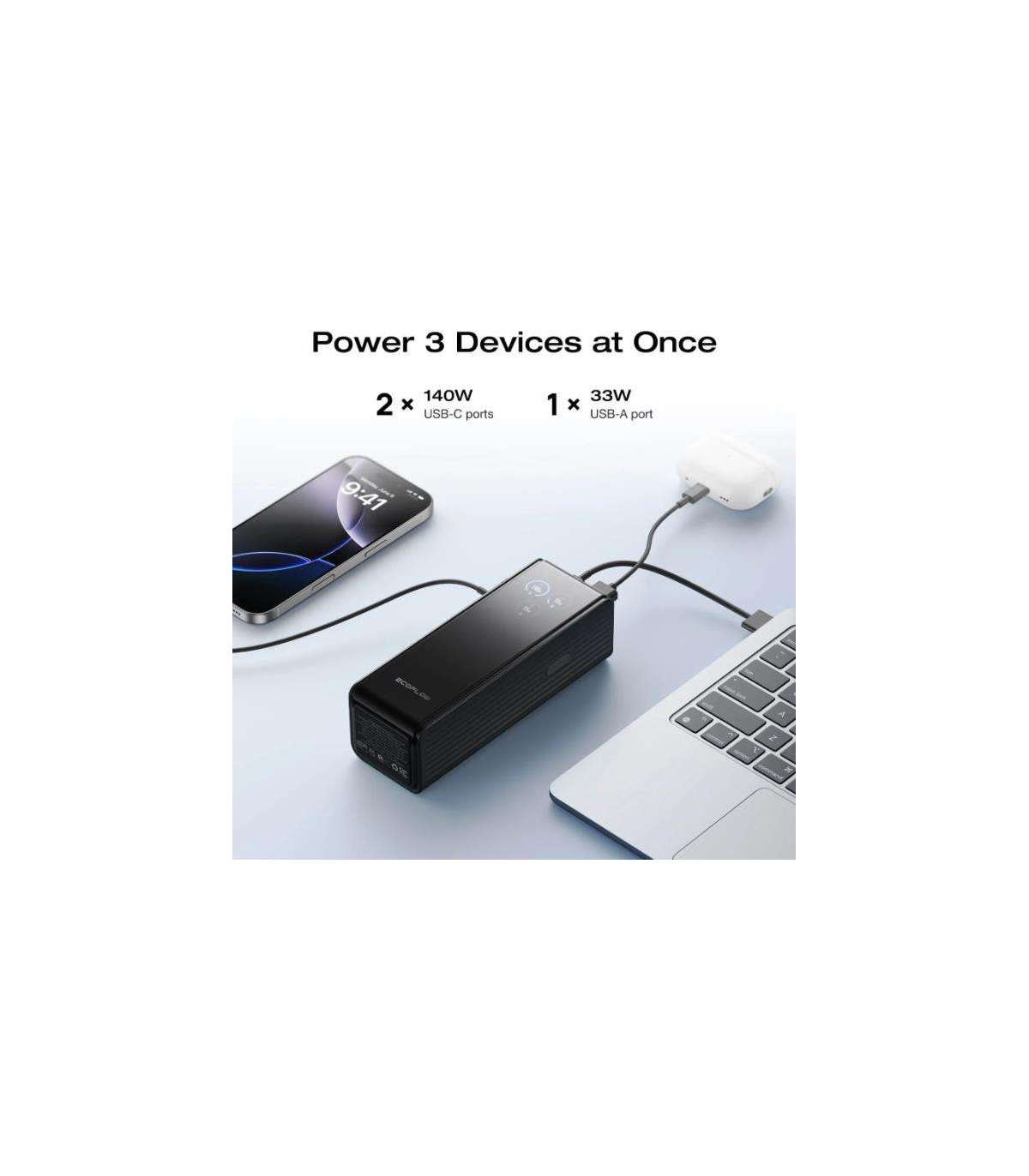 170W Fast Charge: Simultaneous multi-port output up to 170W, supports charging up to 3 devices at the same time. 140W max for single-port charging.