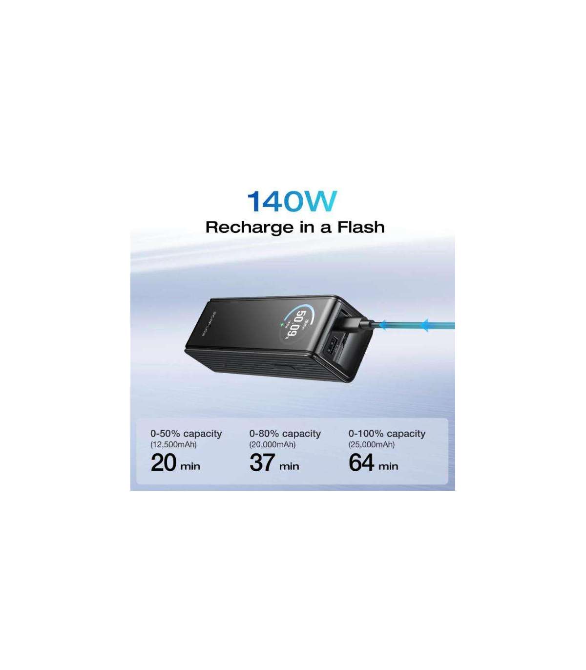 140W Max Input Power: The power bank can be recharged from 0% to 50% capacity in approx. 20 minutes.