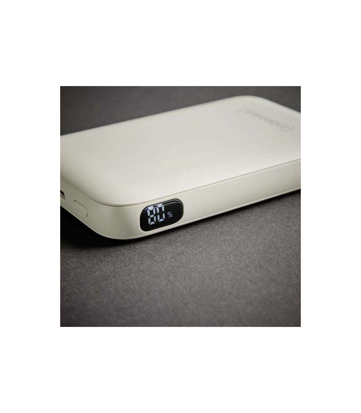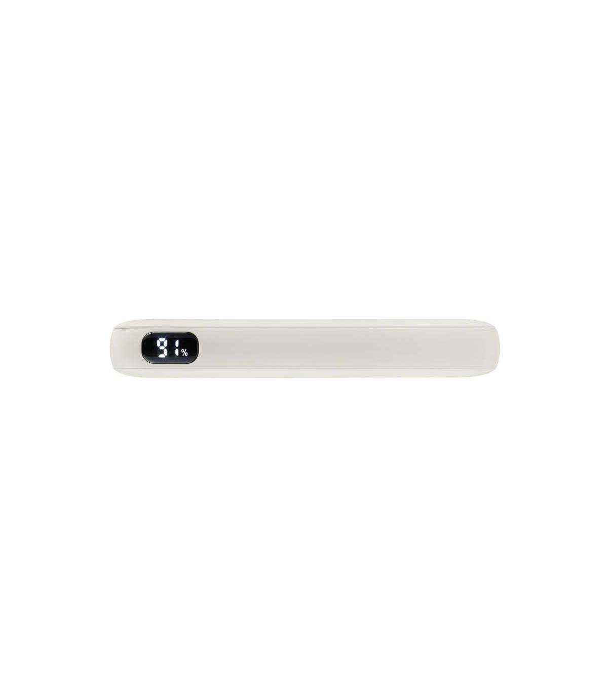 With its slim design (113 × 72 × 17 mm) and stylish color options in beige and gray, the power bank combines modern elegance with practicality. The compact housing fits comfortably in your hand and easily into any bag. The numerical LCD display precisely shows the current charge level in percent – giving you full control over the remaining battery power at all times.