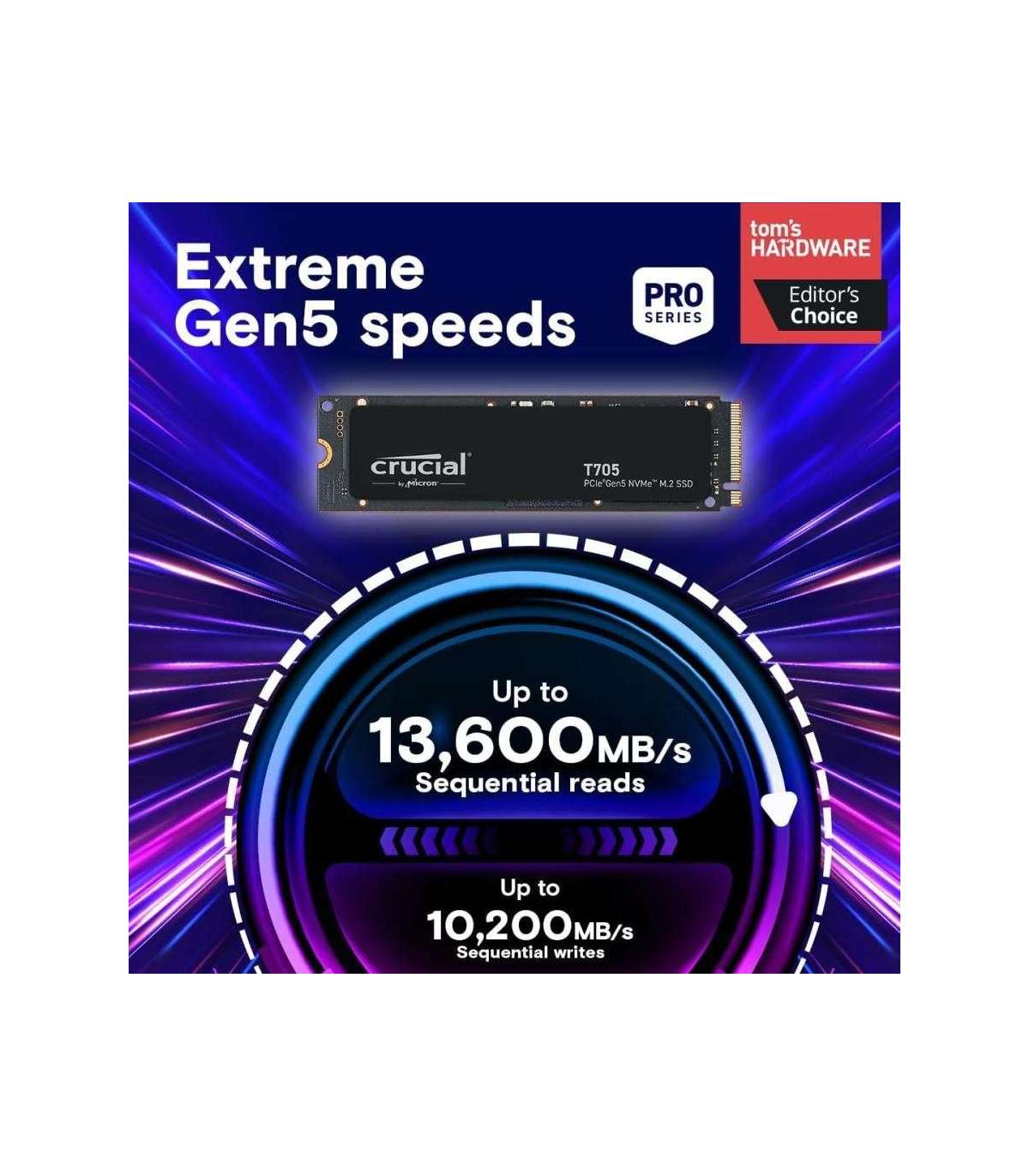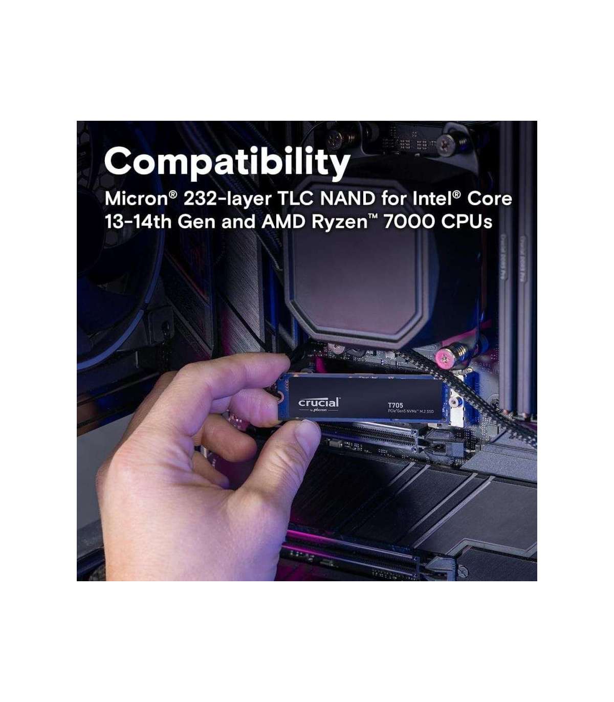 The Crucial® T705 Gen5 NVMe® SSD is taking Gen5 performance to the next level. Fuel your gaming, create at the speed of ideas, and power through AI applications with ease with this fully optimized Gen5 masterpiece that works with your motherboard heatsink.