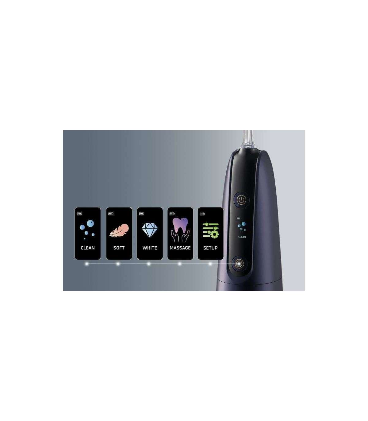 5 Jet Tips: Standard Nozzle, Pocket Tip, Orthodontic Tip, Tongue Scraper, Nasal Nozzle